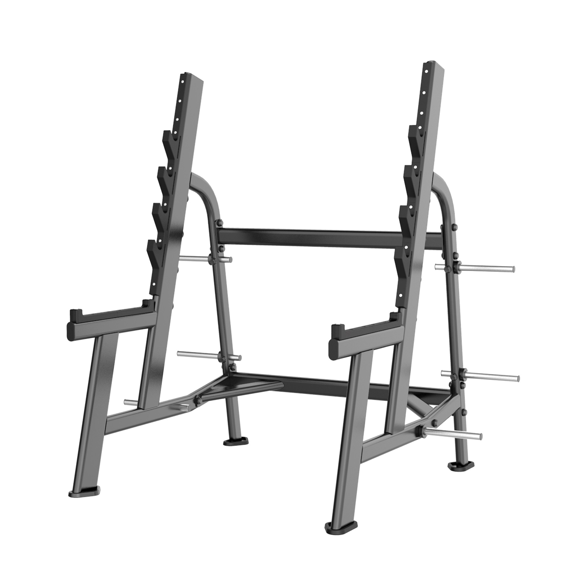 Ограничители, расположенные по длине стойки позволяют располагать штангу на различных уровнях. Свободное место, между упорами стойки, позволяет разметить скамью и выполнять упражнения из положений лежа или сидя. Кронштейны для дисков позволяют быстро прибавить или убавить вес на снаряд.