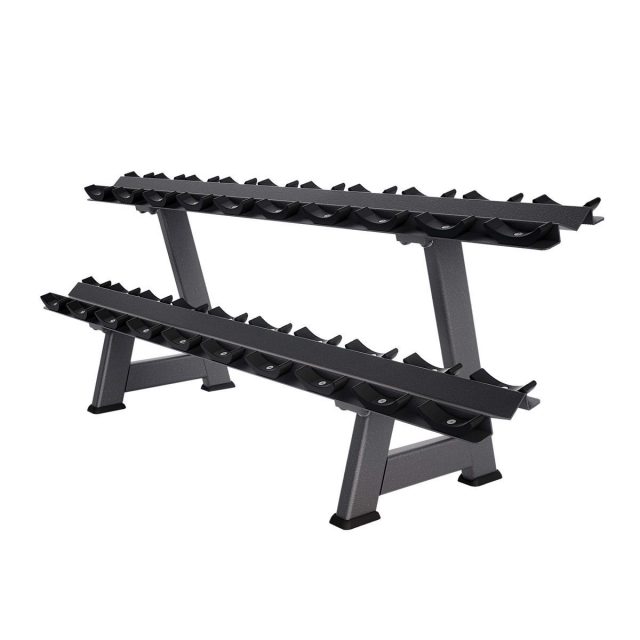 Позволяет поддерживать порядок в зоне силовых тренировок, экономит место, обеспечивает безопасность хранения гантелей.