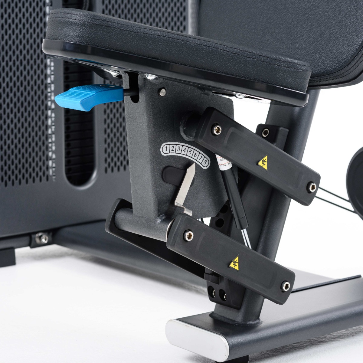 Спинка и регулируемое при помощи сдвоенной системы газовых упоров в восьми положениях анатомическое сиденье велосипедного типа выполнены из вспененного полиуретана с обивкой из премиальной искусственной кожи.