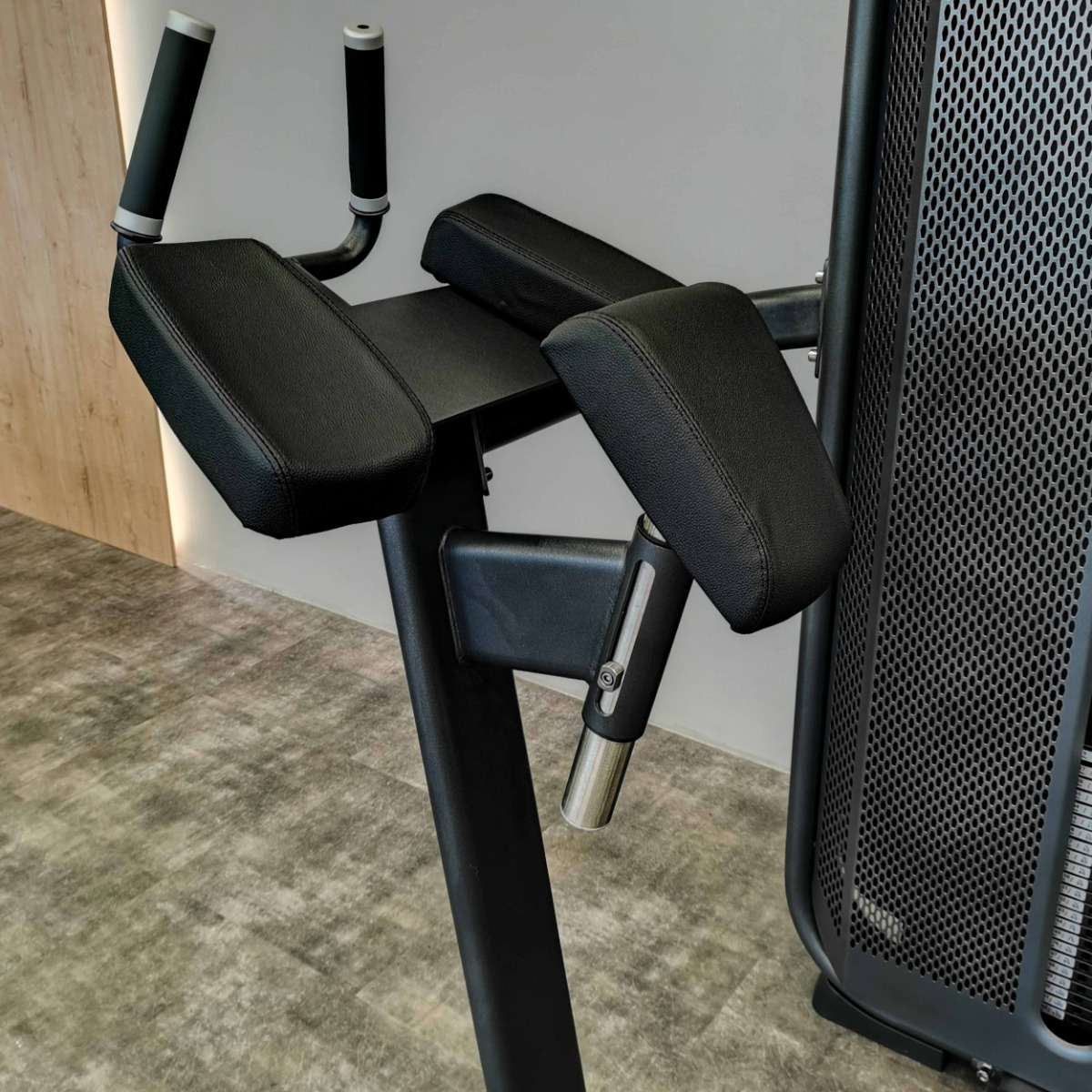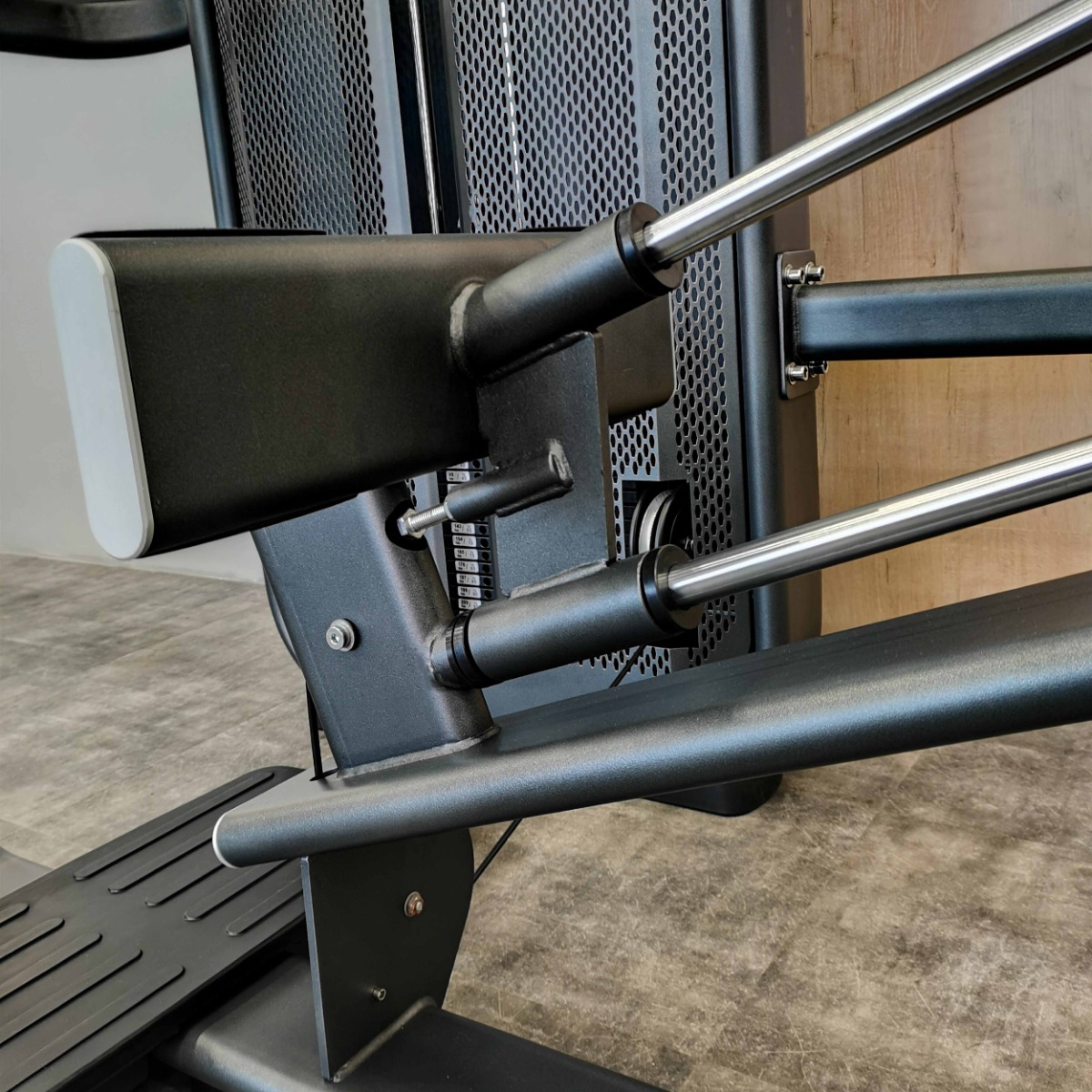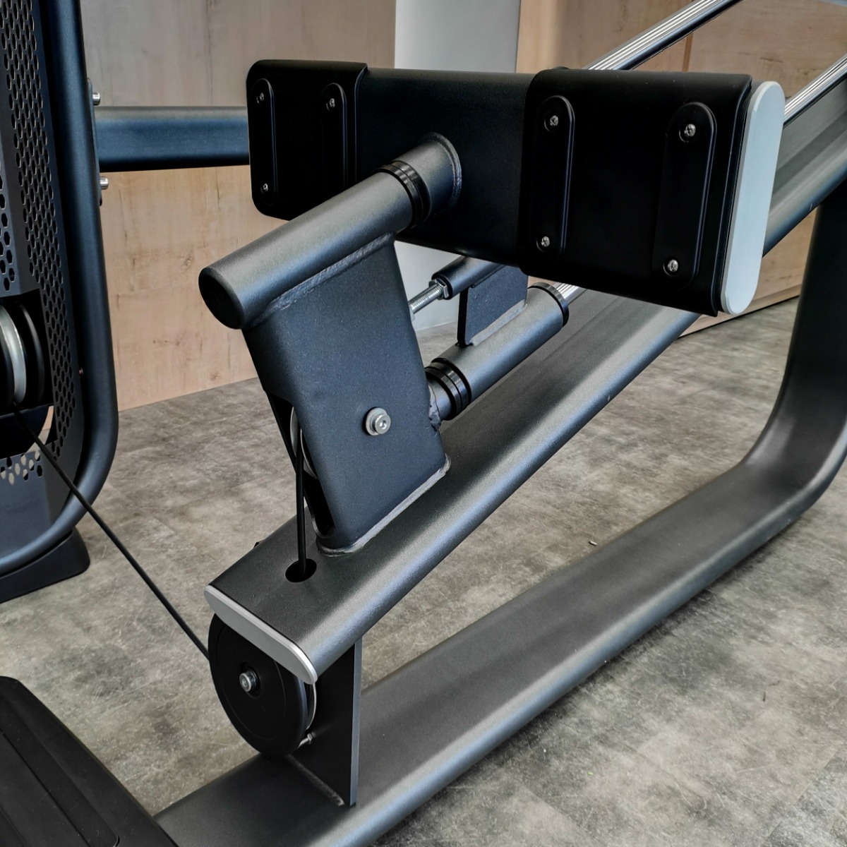 Рычаг для ног, оборудованный нескользящими пластиковыми вставками с рифленой поверхностью для устойчивого положения, движется по нелинейной траектории, тем самым обеспечивает концентрацию на целевых мышцах.