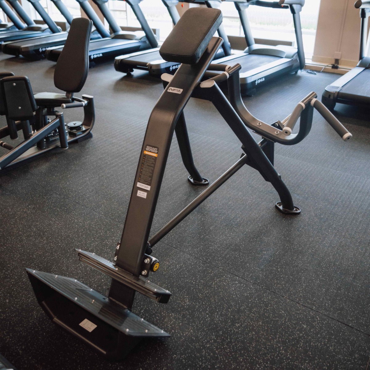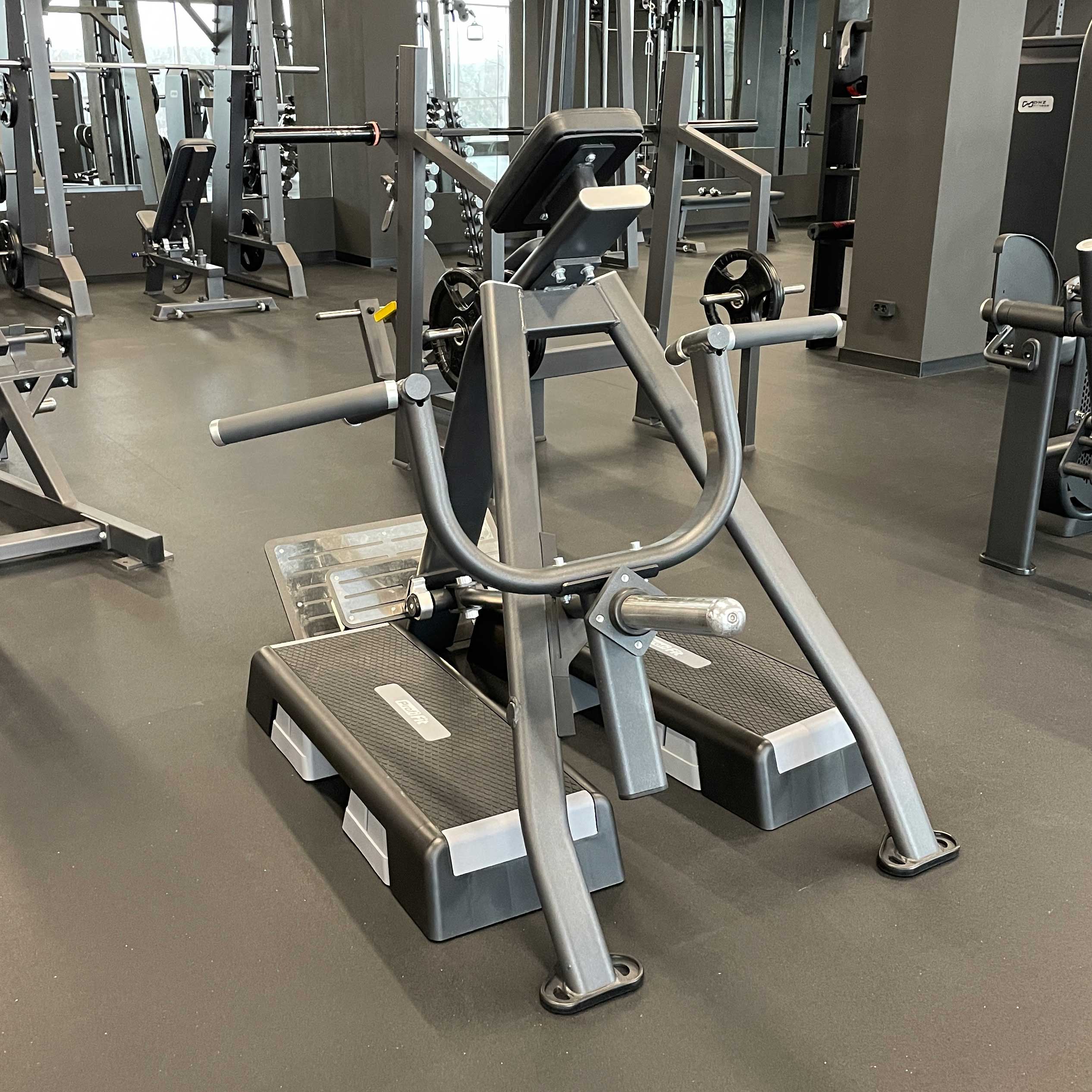 Двухуровневая платформа для ног для пользователей разного роста имеет рифленую поверхность для предотвращения скольжения при выполнении упражнения.