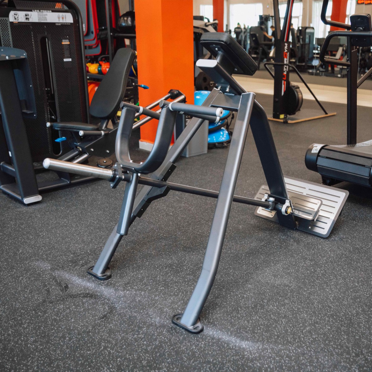 На тренажере закреплен один металлический накопитель для работы со свободными весами, оборудованный кольцом из плотной резины для предотвращения механических повреждений при соприкосновении дисков с рамой.