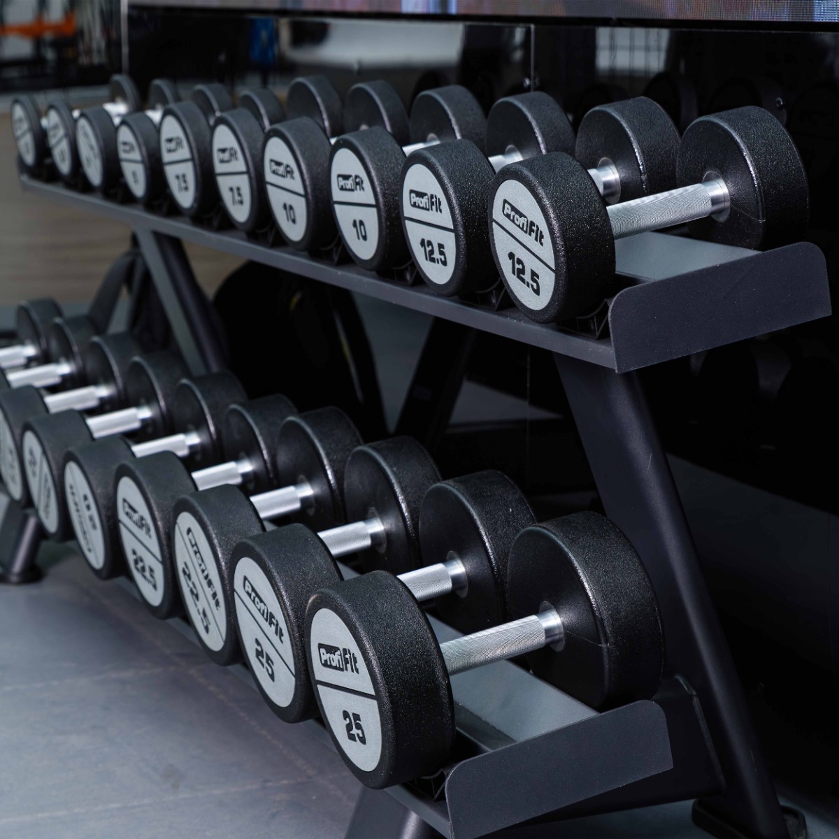 На двухуровневой стойке закреплено 40 чашеобразных ложементов, обеспечивающих надежную фиксацию и безопасность при использовании оборудования. Предназначено для размещения 20 гантелей (10 пар гантелей).