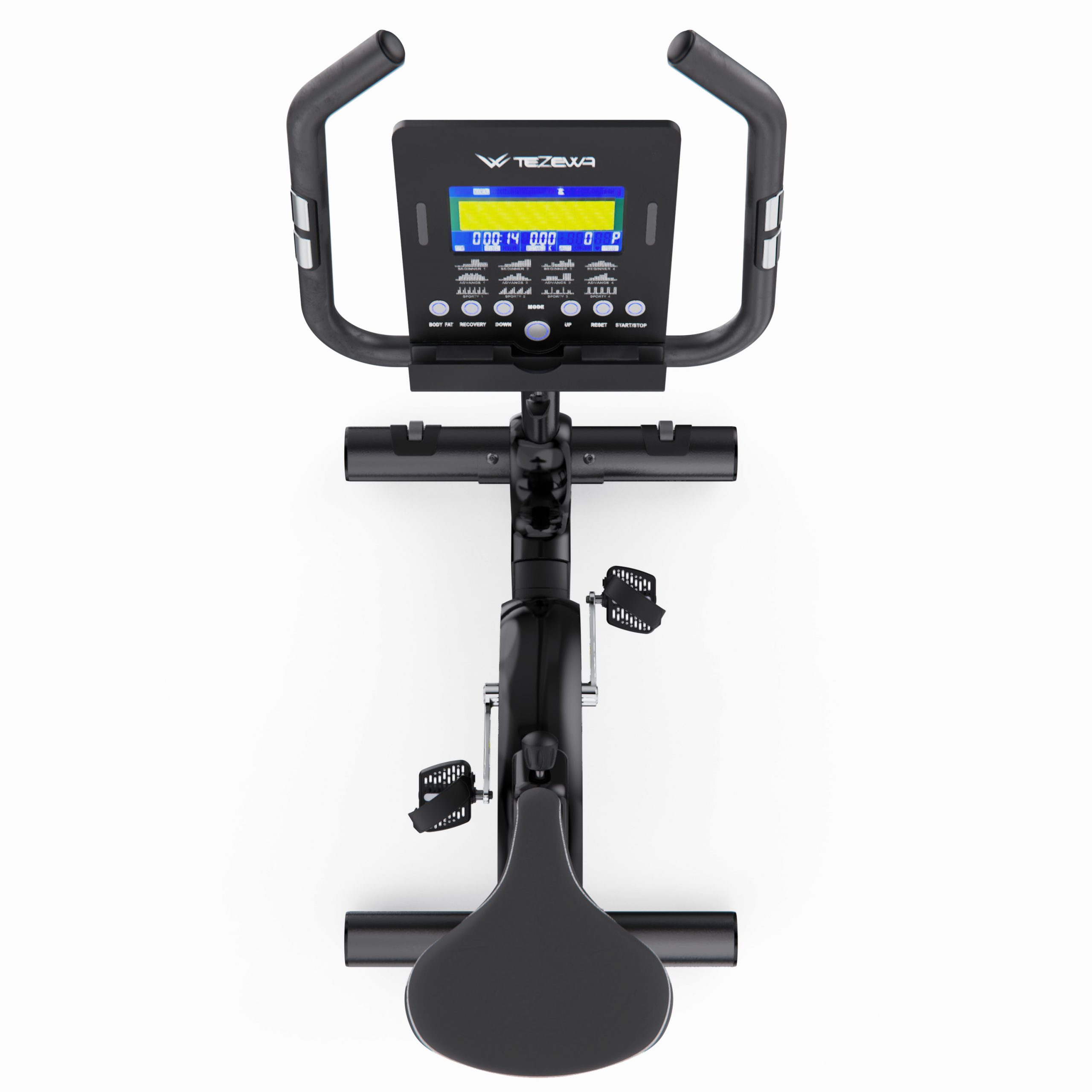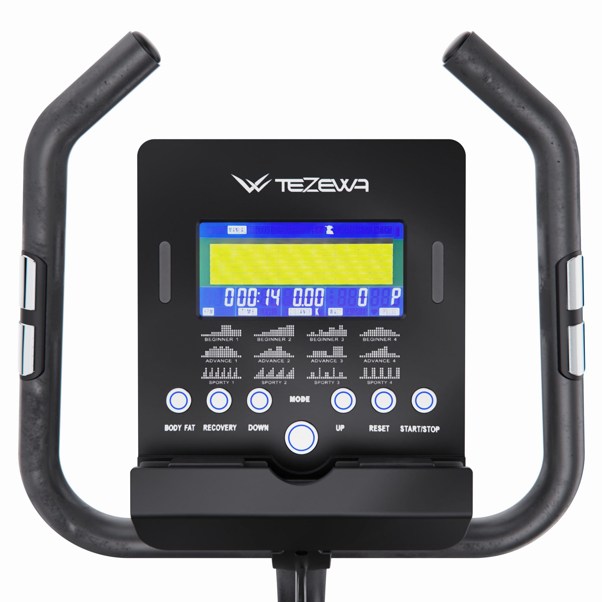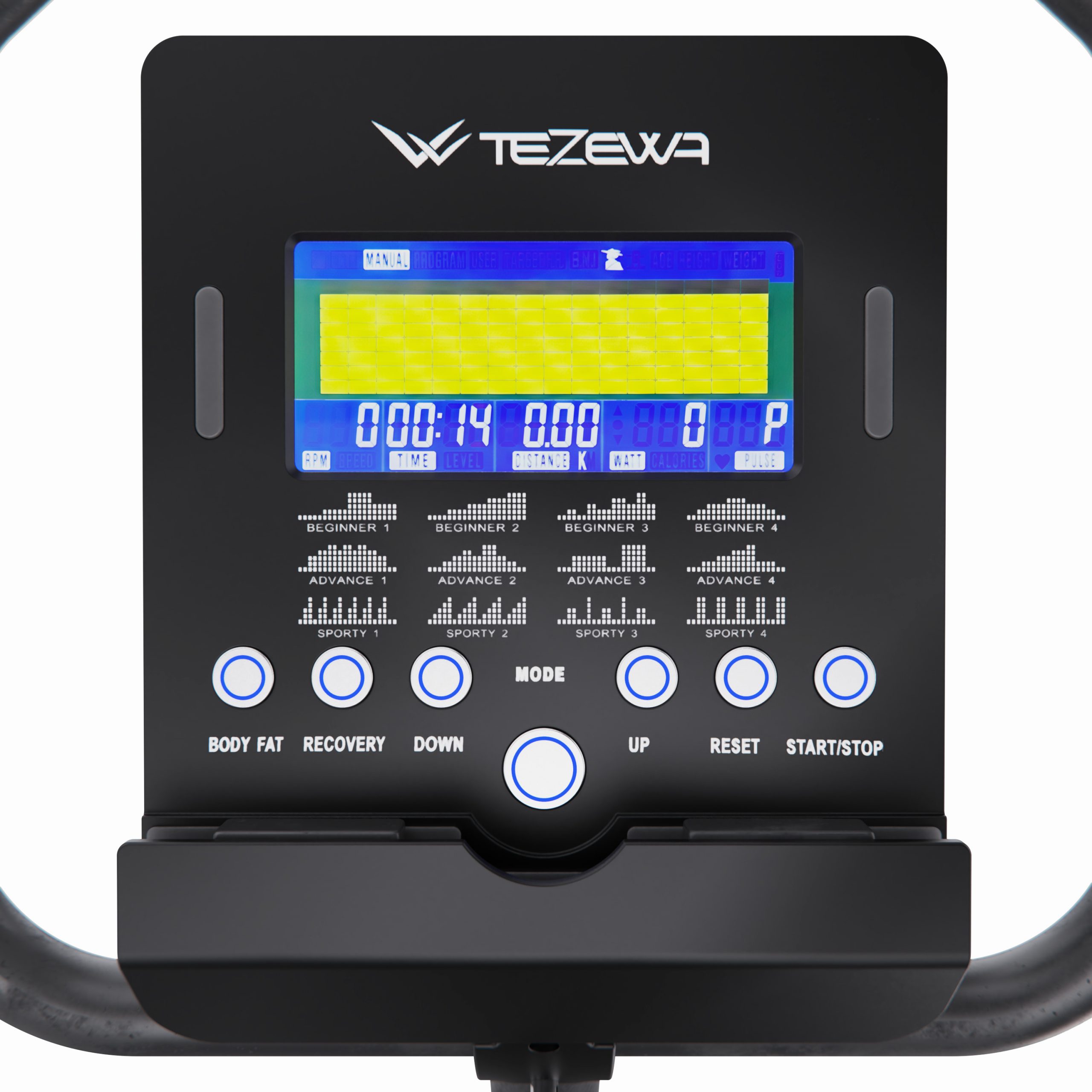 Тренажёр оснащён 18 встроенными программами, включая ручной режим, 16 автоматических программ для разных уровней подготовки и программу Watt с поддержкой заданной мощности и автоматической регулировкой нагрузки. На встроенном LCD-дисплее с синей подсветкой отображаются все важные параметры тренировки: время, скорость, дистанция, калории, пульс (сенсорные датчики на поручнях), обороты в минуту (RPM), а также мощность в ваттах. Это делает тренировки максимально контролируемыми и эффективными.