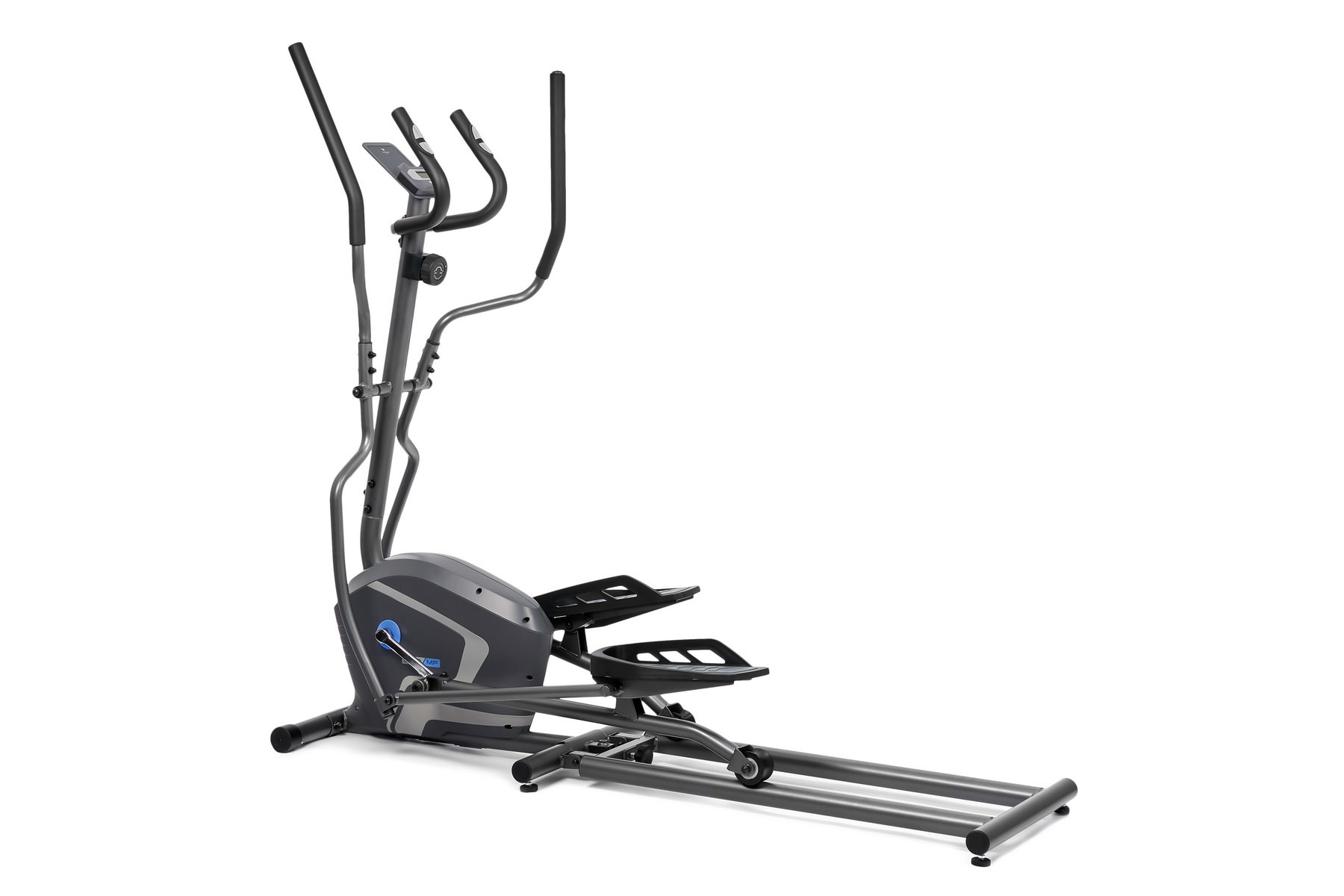 Тренировочный компьютер представлен черно-белым LCD-дисплеем с удобной подставкой под смартфон или планшет. На экран выводятся все основные параметры тренировки — время, дистанция, скорость, калории, обороты в мин. и пульс. Измерение пульса происходит путем удержания ладоней на сенсорных датчиках пульса, расположенных на поручнях. Нагрузка регулируется механическим путем в 8 положениях. К числу дополнительных характеристик эллипсоида относятся такие опции как транспортировочные ролики и компенсаторы неровностей пола. Переместить изделие из одного места в другое не составит большого труда, а компенсаторы позволят отрегулировать положение ножек на неровной поверхности.