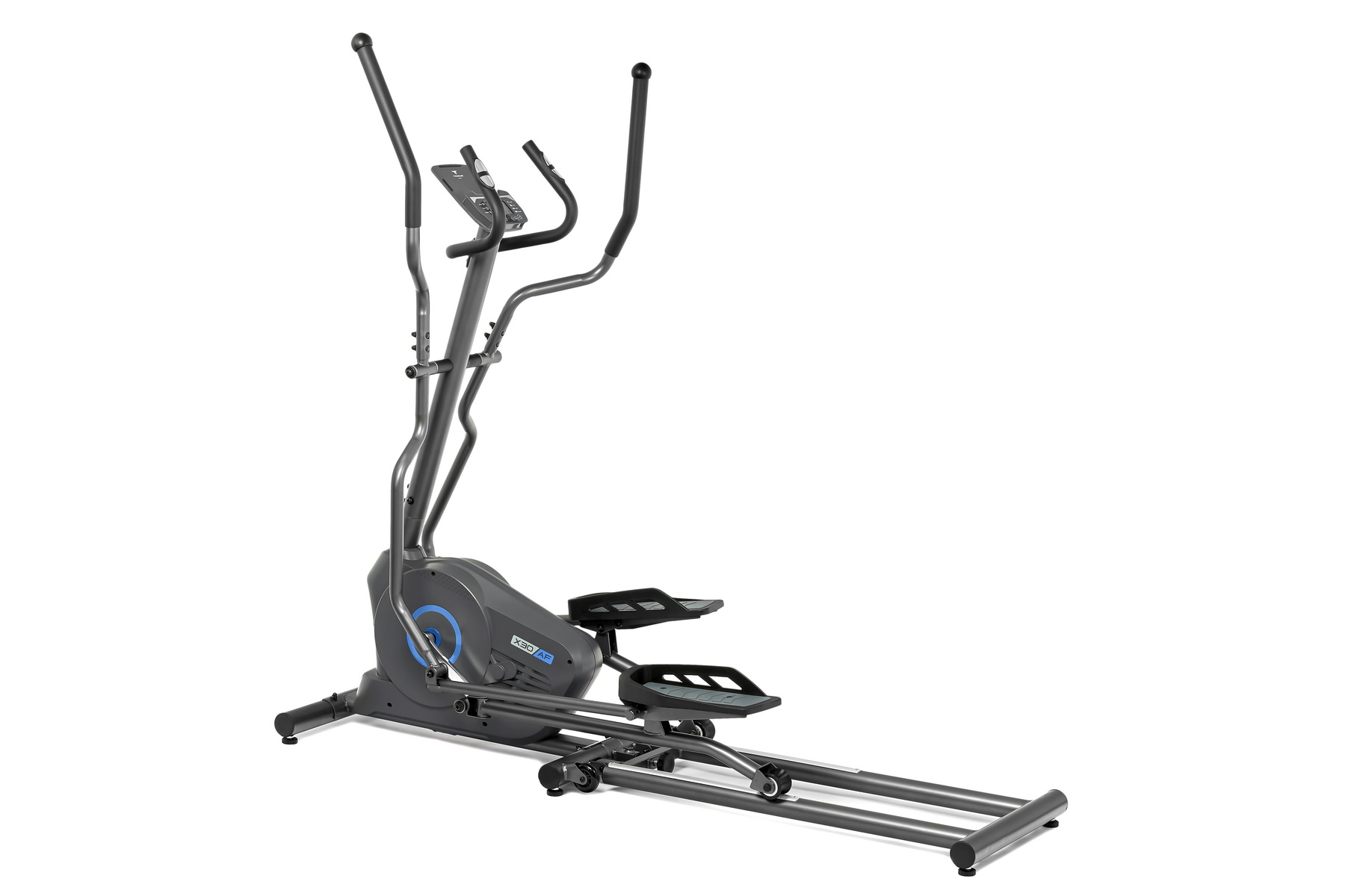К числу важных биомеханических характеристик относится длина шага 42 см. Это достаточное базовое значение, которое в сочетании с удачной конструкцией рамы и качественных компонентов создает ощущение тренажера классом выше. Q-фактор (S.Q.F. – small Q-Factor) составляет 18 см – это вполне комфортный показатель, положительно влияющий на технику движения. Важный элемент биомеханики любого переднеприводного эллипса – ролики, двигающиеся по рельсовой раме. В Titanium One X30 AF используются высококачественные малошумные ролики с улучшенным коэффициентом скольжения, выполненные из высокотемпературного термопластичного полиуретана (TPU) с впрессованными подшипниками производства NSK. Сбалансированный утяжеленный маховик с инерционным весом 17,6 кг добавляет комфорта в общую копилку. Устойчивость и безопасность во время тренировки придают педали увеличенного размера с рифленой поверхностью. Два типа поручней позволяют комфортно тренироваться людям любого роста и комплекции.