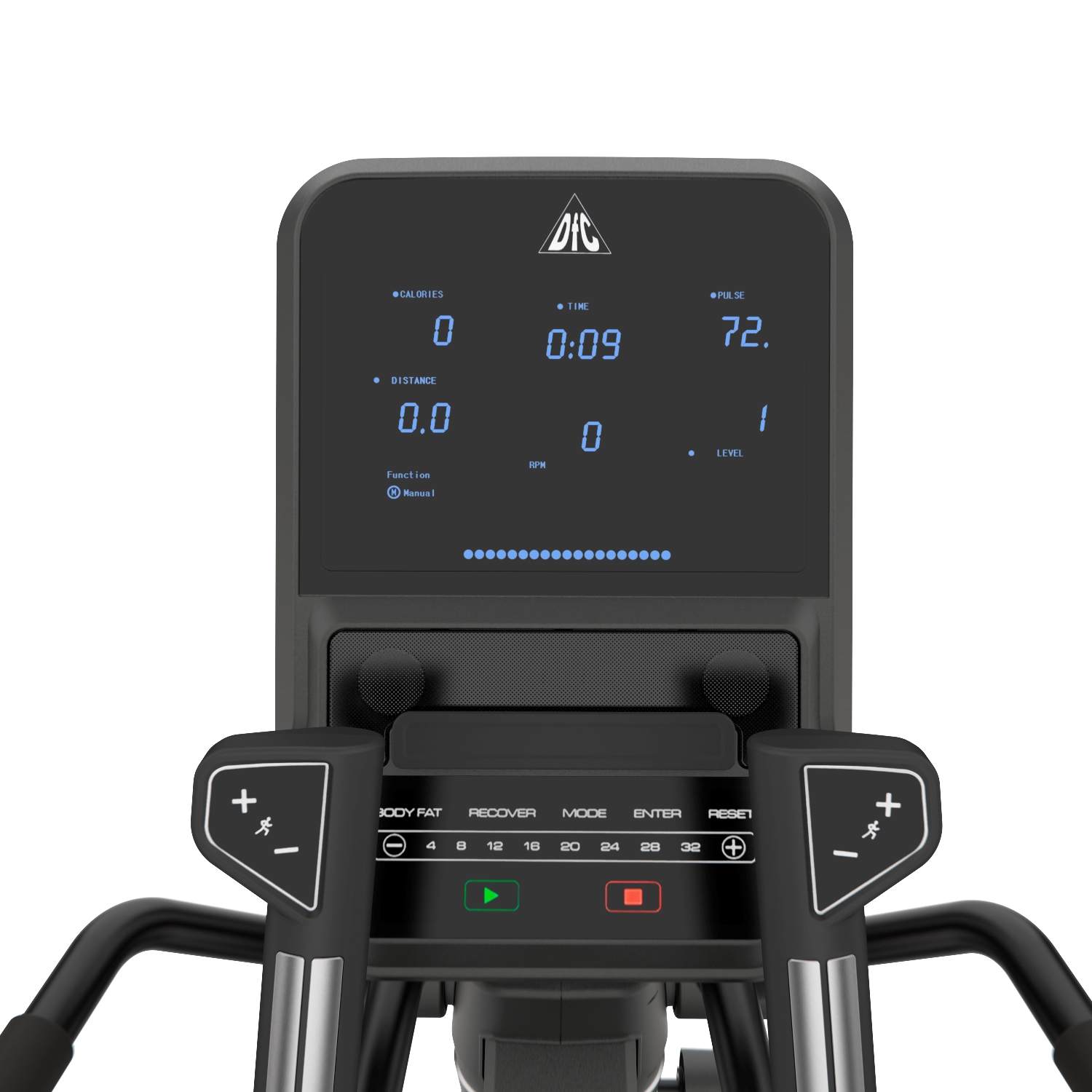 Для занятия можно выбрать одну из 12 встроенных программ тренировок, каждая из которых адаптирована под определённые требования. Большой цветной дисплей с размерами 22х28 см отображает основные показатели: скорость, дистанцию, уровень сложности, время занятия, расстояние, количество сожжённых калорий, пульс. Датчики пульса расположены на поручнях. MP3 и USB вход позволяют прослушивать музыку во время тренировки.