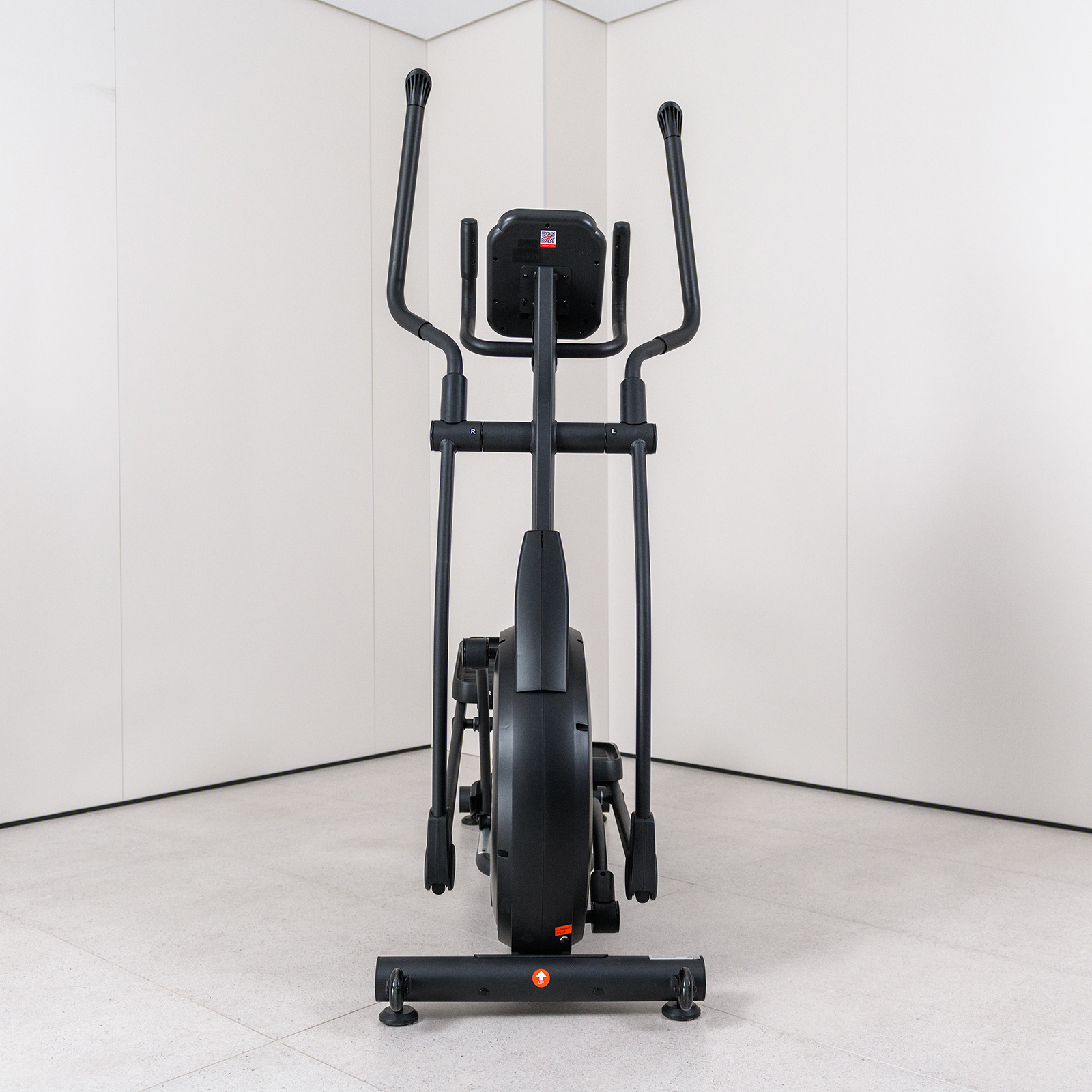 Надежность конструкции позволяет использовать тренажер пользователям весом до 140 кг. Трехкомпонентный педальный узел гарантирует долговечность. Транспортировочные ролики и компенсаторы неровности пола обеспечивают легкое перемещение и устойчивость орбитрека.