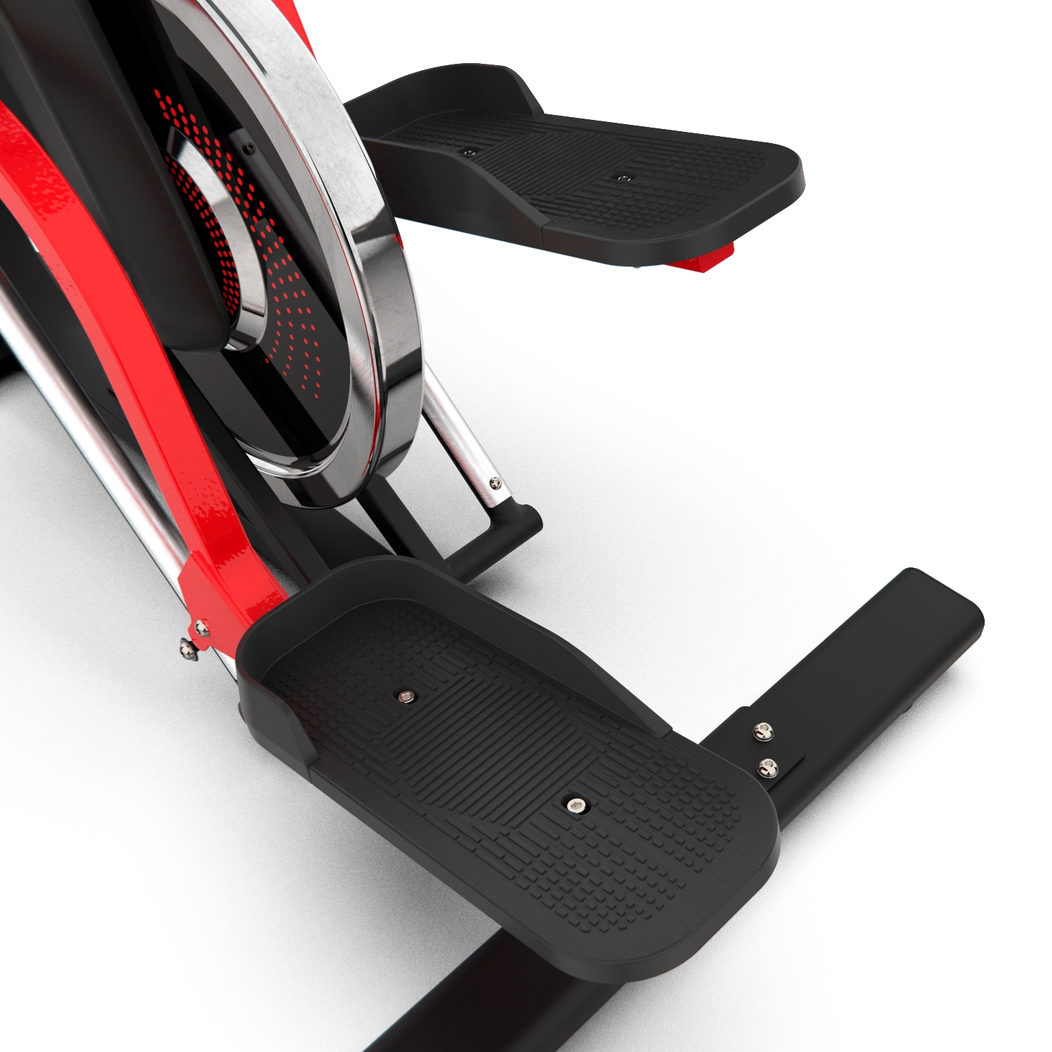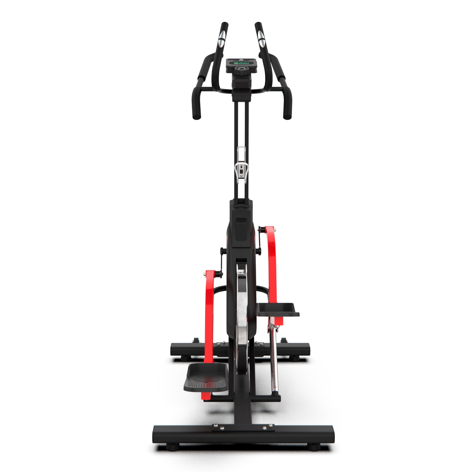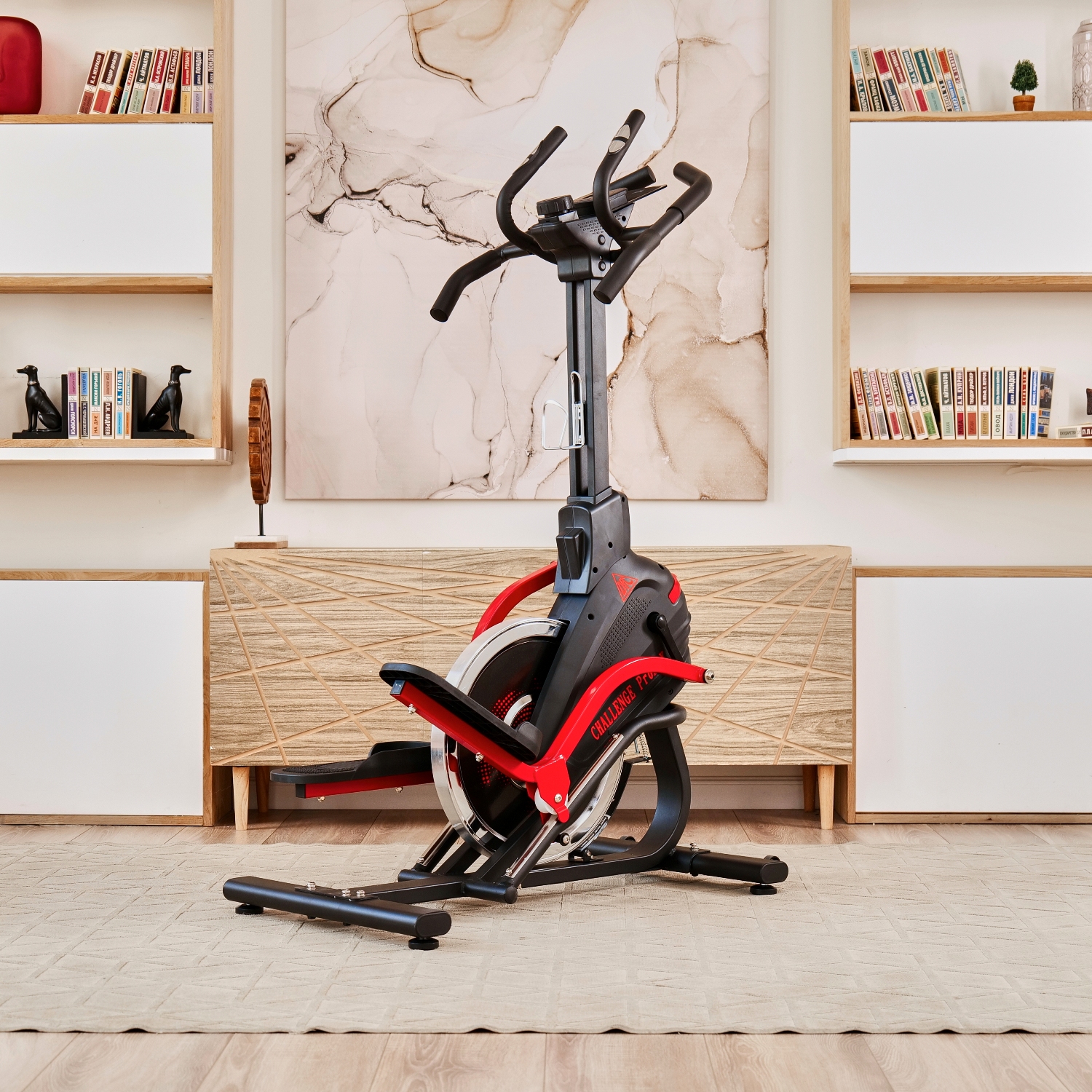 Представляем новую модель Challenge ProMAX популярной серии эллиптического тренажера с функционалом степпера. Тренажер Challenge ProMAX имитирует восхождение в гору под углом 40° и высотой шага 22 см, и нагружает больше различных групп мышц, чем классический эллептик или степпер. Сбалансированный маховиком весом 7 кг (инерционный вес 10 кг). Механическая модель с колодочной системой нагружения и ременным приводом обеспечивает практически бесшумную работу тренажера во время тренировки. Изменение колоочной нагрузки происходит с помощью механического регулятора на стойке, всего 8 положений регулировки. Большие педали с бортиком и нескользящей поверхностью для надежной фиксации ноги практически любого размера. Удобные изогнутые поручни оригинальной формы с мягкими накладками. Модель оснащена компактной консолью и отображает следующие параметры тренировки: время, скорость, калории, пульс и расстояние (относительная величина расстояния восхождения в гору) Консоль выполнена в форме держателя под планшет или смартфон. Удобно прослушать трек или посмотреть любимое видео во время тренировки.