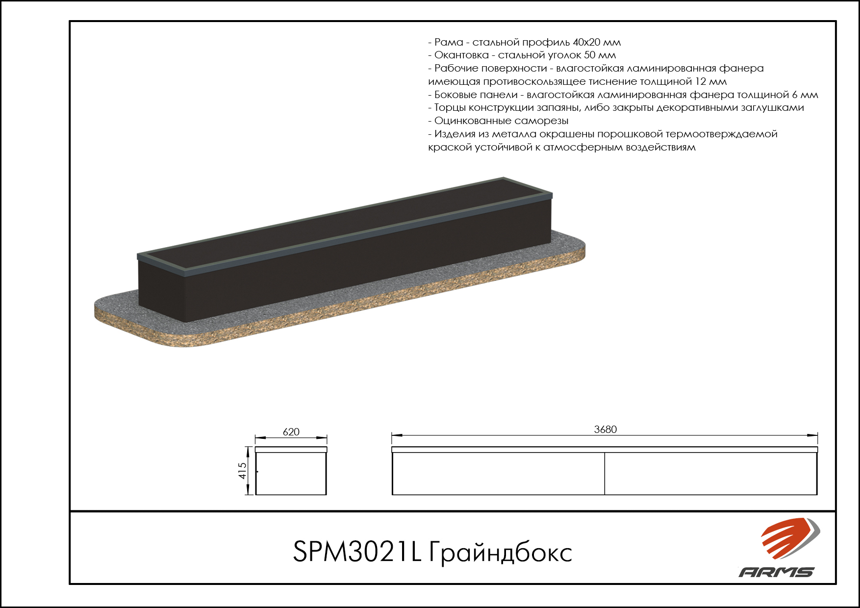 Горизонтальная коробка со скатами в три стороны, дополнительным элементом являются ступени с рейлом, что усложняет и увеличивает количество упражнений и трюков на скейтборде, роликах, трюковых самокатах и велосипедах BMX.