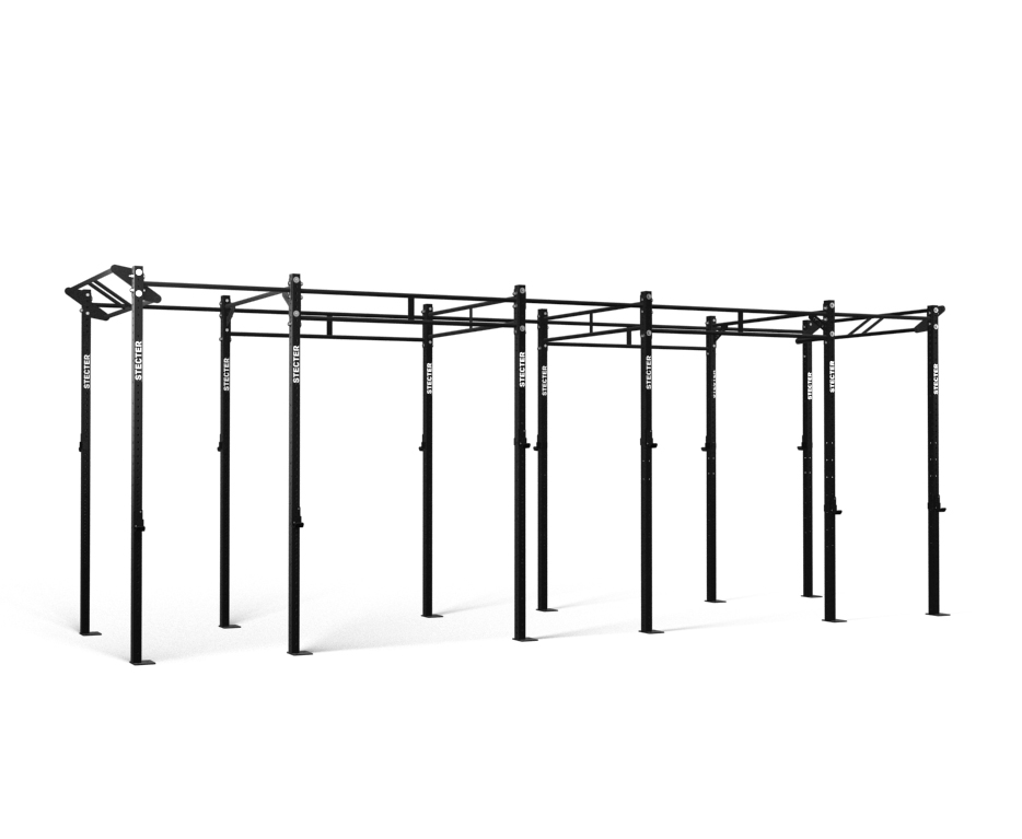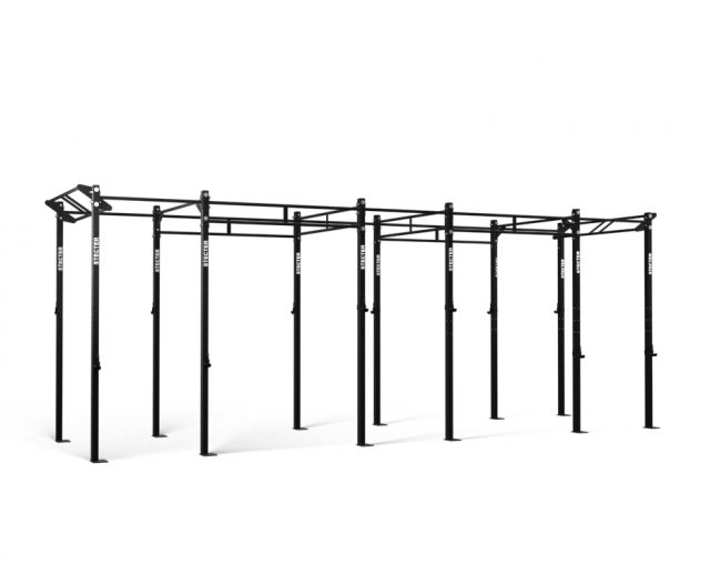 Функциональная рама для Кроссфит 6900х1800 состоит из пяти секций шириной 1100 мм и 1800 мм. Двенадцать вертикальных стоек высотой 2810 мм скреплены в верхней части одинарными и двойными перекладинами для подтягиваний. Так же в комплекте идут 6 пар J-крюков для штанги. Для сборки рамы требуется десять перекладин по 1800 мм в ширину и шесть перекладин по 1100 мм в ширину. Рама обладает высотой, достаточной для крепления гимнастических колец, каната и т. д. Конструкцию собирается в единое целое при помощи крепежей, которые также входят в комплект.