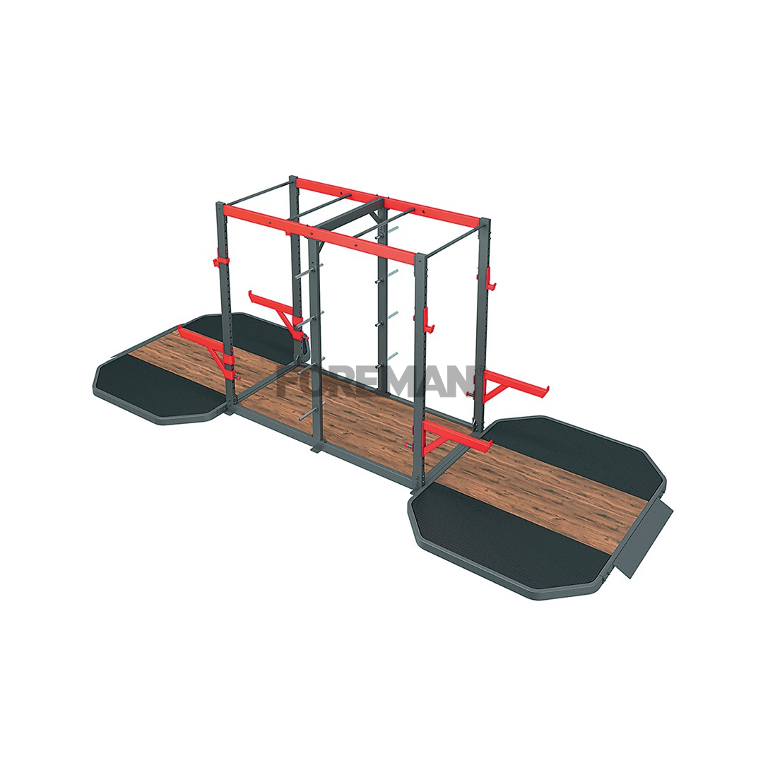 - Рамы оборудованы навесными держателями для удержания штанги и навесными уловители штанги с П-образными стальными упорами для выполнения отжиманий, приседания с использованием отягощений.