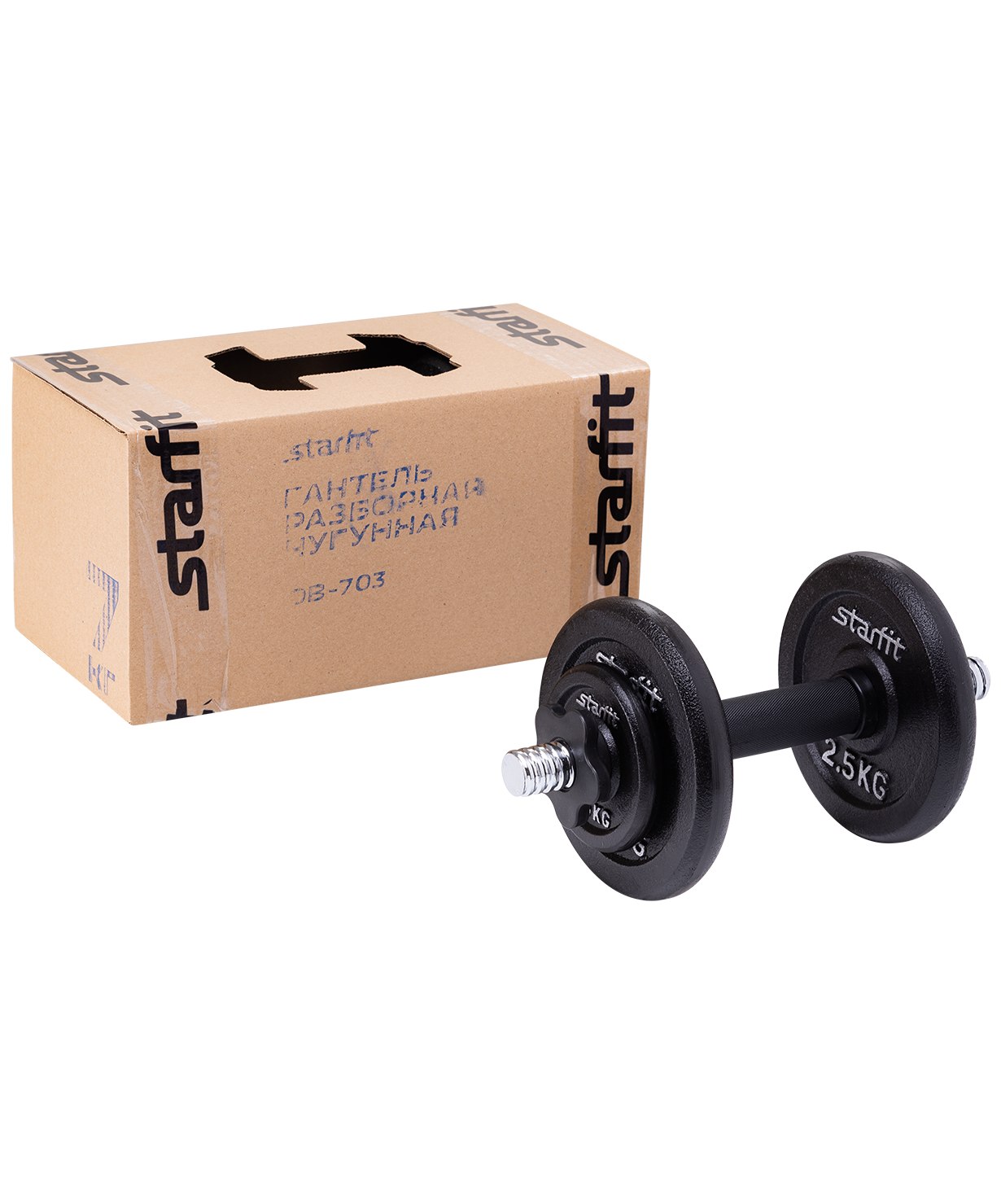 Упакована в коробку из качественного гофрокартона с оригинальной вырубкой для удобной переноски гантели.