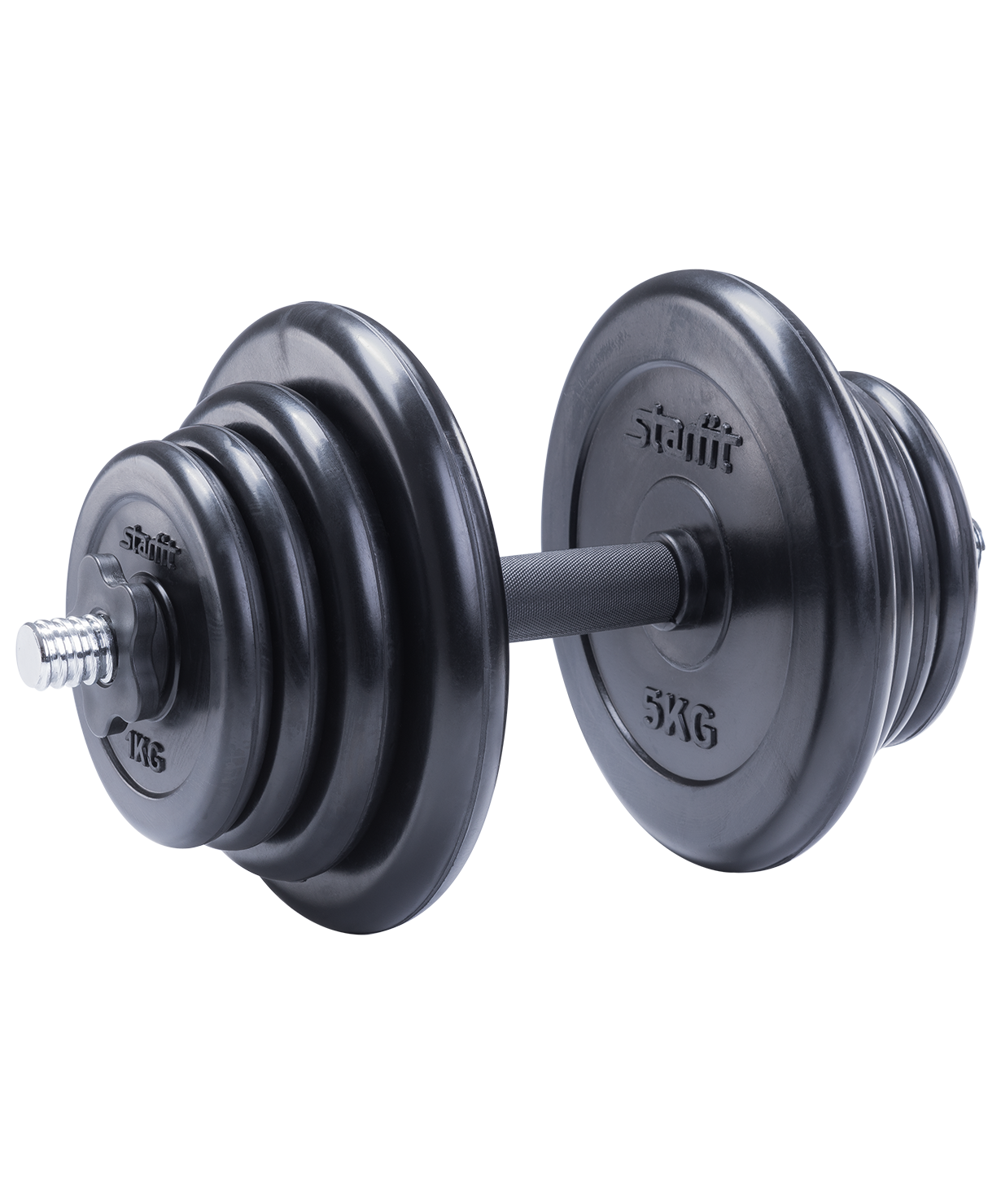 Гантель DB-702 состоит из стального грифа и восьми обрезиненных дисков разного веса. Резиновое покрытие повышает срок службы диска, минимизирует шум от занятий. Гантель удобно держать в руке. Нескользящая пластиковая поверхность грифа на месте хвата повышает безопасность тренировок. Широкий шаг резьбы позволяет за считанные секунды поменять вес. Гриф комплектуется пластиковыми замками, которые надежно фиксируют диски на месте.