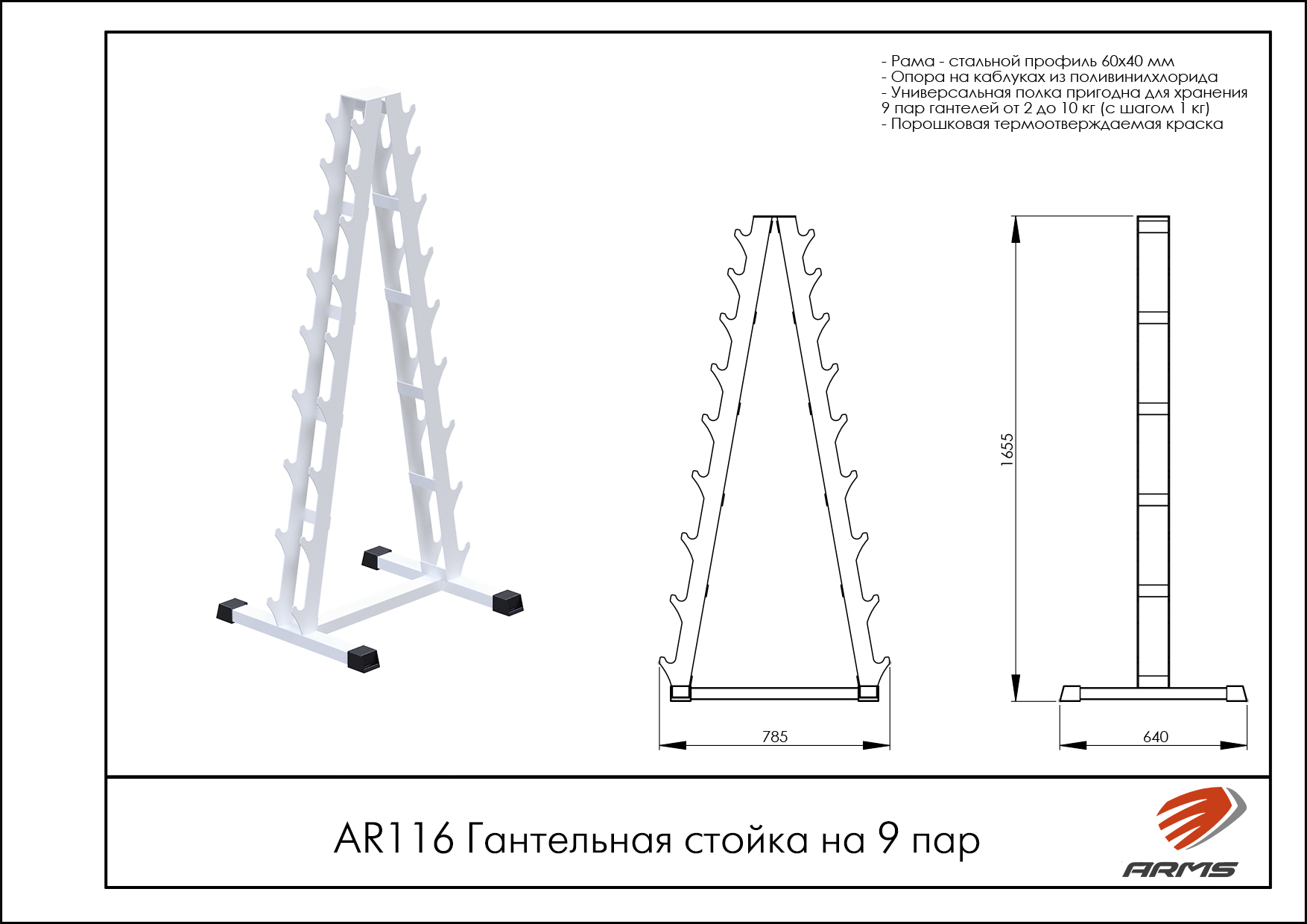 Универсальная полка пригодна для хранения до 9 пар гантелей от 2 до 10кг (шаг 1кг).
