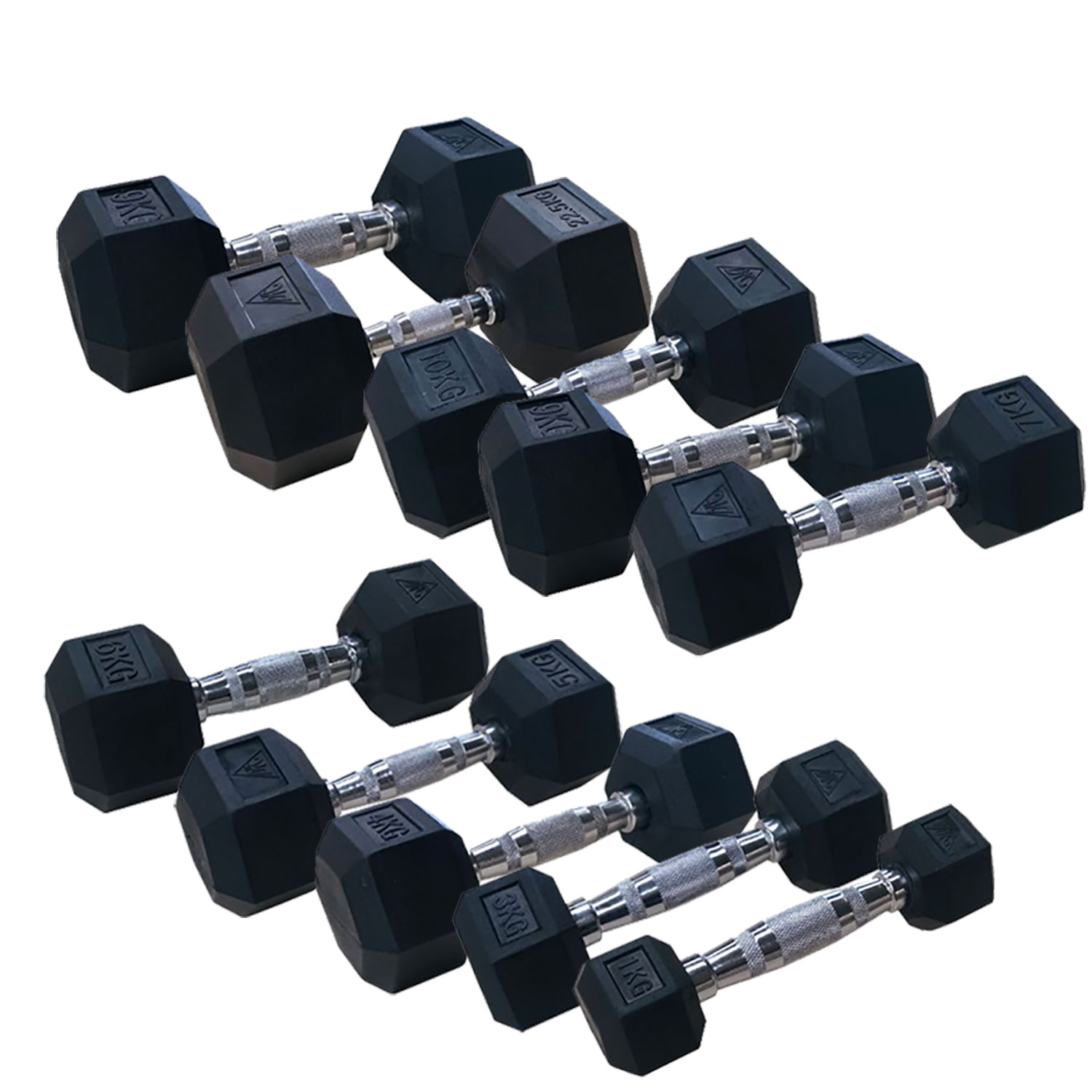 Набор включает следующие гантели: 2 x 1 кг, 2 x 2 кг, 2 x 3 кг, 2 x 4 кг, 2 x 5 кг, 2 x 6 кг, 2 x 7 кг, 2 x 8 кг, 2 x 9 кг, 2 x 10 кг, 2 x 12,5 кг, 2 x 15 кг