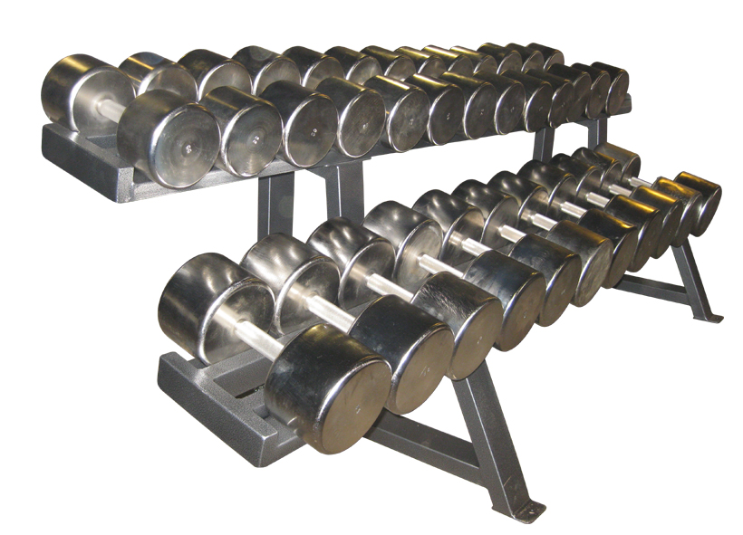 Гантели стальные с комплексным покрытием из никеля и хрома. Основное преимущество стальных хромированных гантелей — их компактность при внушительном весе, из-за высокой плотности стали. Поверхность гантелей шлифована, края закруглены, что делает упражнения комфортными и безопасными а рукоятки с глубоким рифлением исключают всякое скольжение гантелей в руке. Хромовое покрытие придает шикарный блеск гантелям и эффектный внешний вид всему комплекту. Гантели размещены на двухрядном стеллаже.