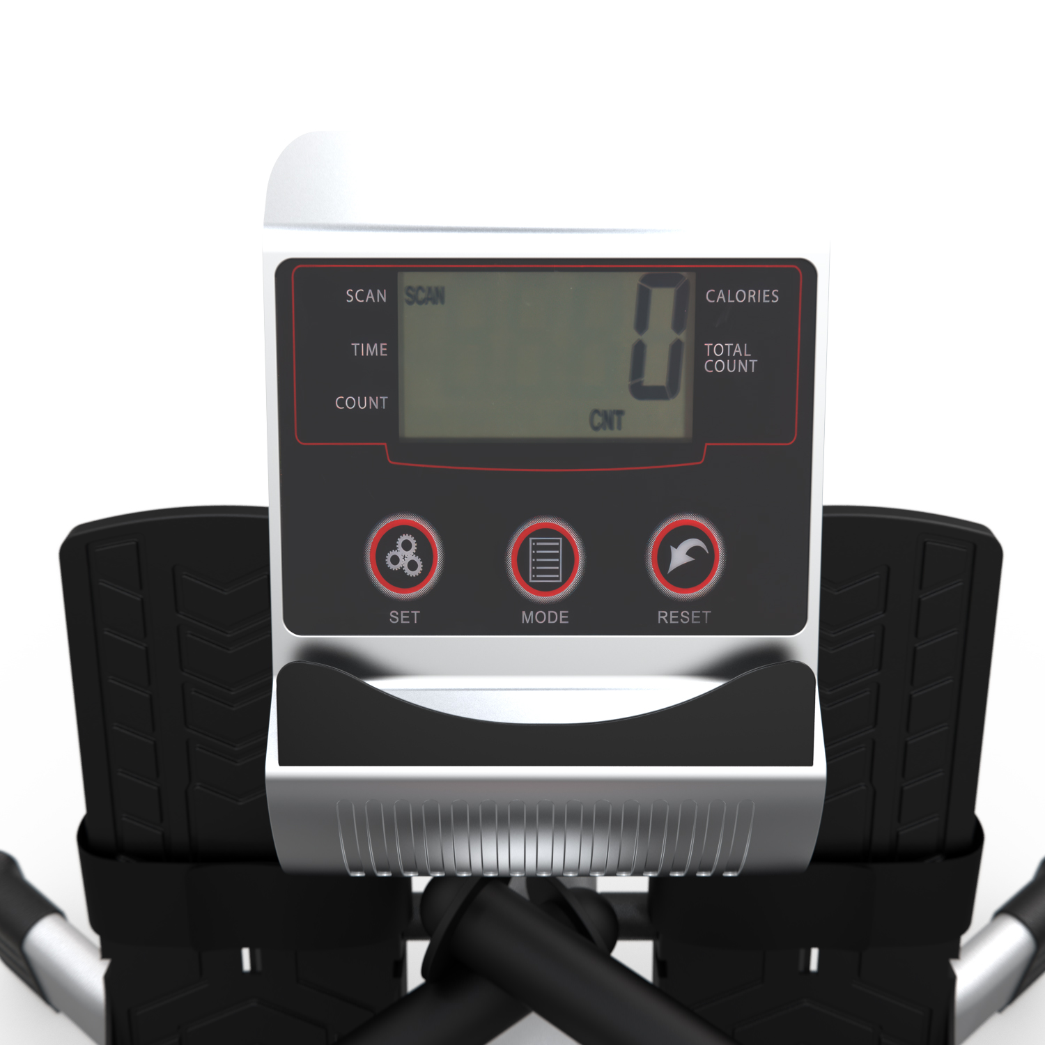 Нагрузка тренажёра создаётся при помощи 2-х гидравлических цилиндров и регулируется с помощью колесика в верхней части каждого цилиндра. Доступно 12 уровней сопротивления, рекомендовано начинать занятия с минимального значения. Дисплей работает от двух батареек типа ААА (не входят в комплект) и отображает следующие параметры: время, количество гребков общее, количество гребков за 1 тренировку и калории. На консоли расположена подставка под планшет.
