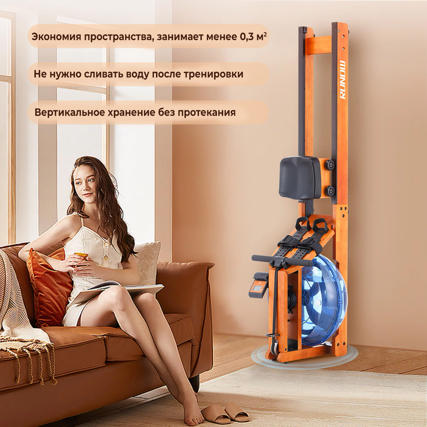 Гребной тренажер DFC Runow 6203 выполнен в цвете Оранжевый дуб и предназначен для пользователей весом до 125 килограмм. Тренажер компактен и может быть установлен вертикально у стены.