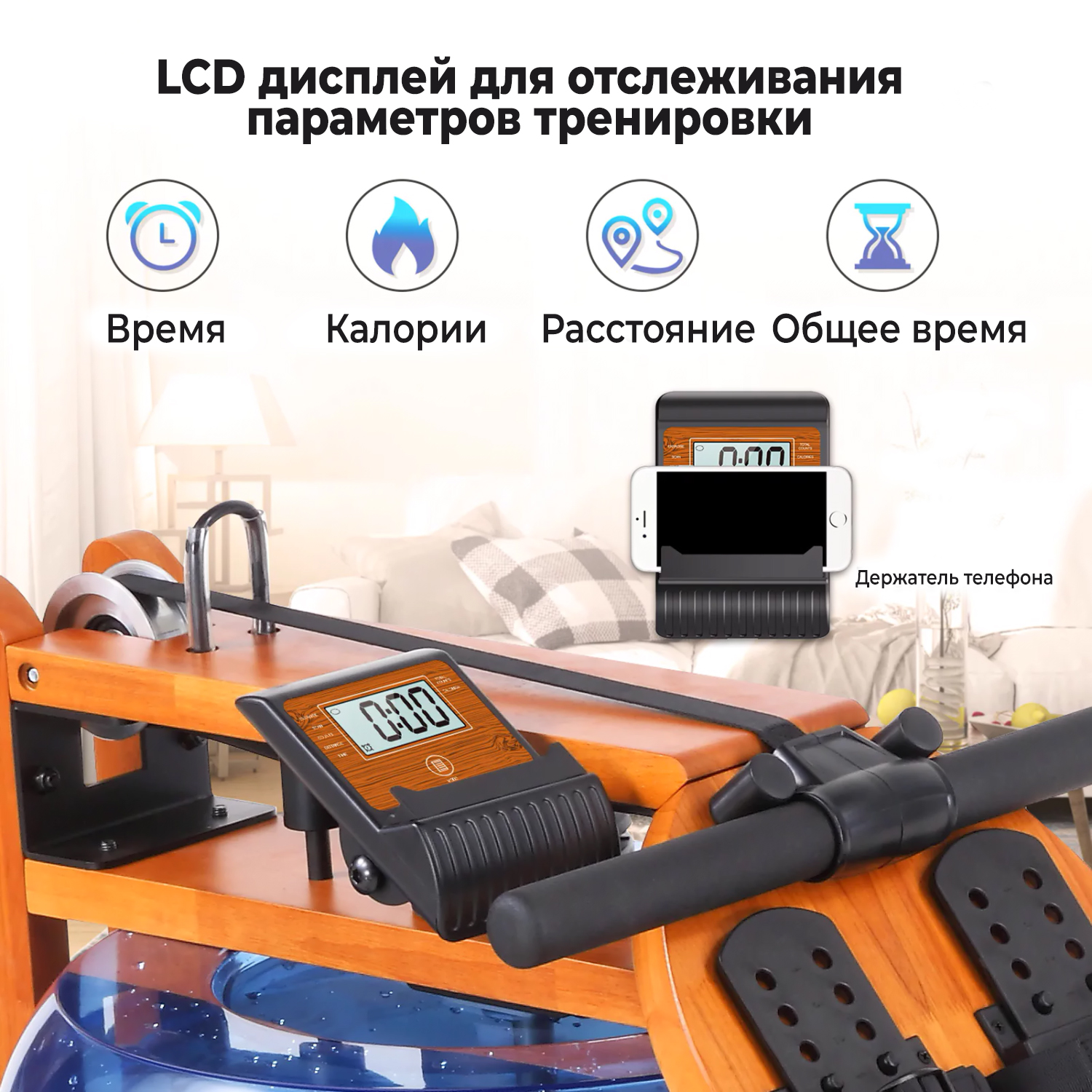Монохромный LCD-дисплей отображает следующую информацию: время, количество гребков, общее количество гребков, расстояние, калории и режим сканирования. Для функционирования консоли необходимы две батарейки типа “AAA”, которые не включены в комплект поставки.