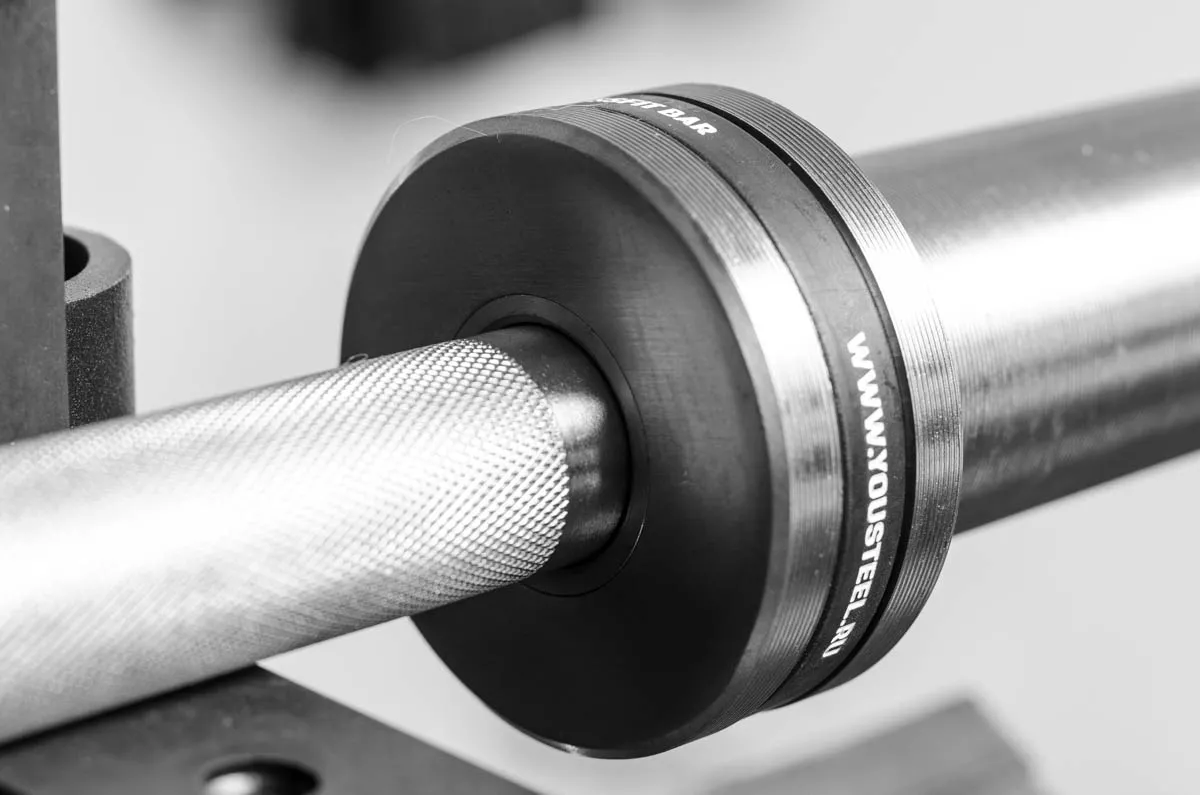 Снаряд имеет вес 20кг. Рукоять грифа покрыта хромом и изготовлена из специальной стали, обладающей высокой прочностью на разрыв в 250k PSI. Гриф имеет отличную упругость, а гибридная насечка обеспечит надежный хват. Нанесены метки IWF и IPL. Внутри втулок десять игольчатых подшипников, которые гарантируют плавное вращать диски даже при самых высоких нагрузках.
