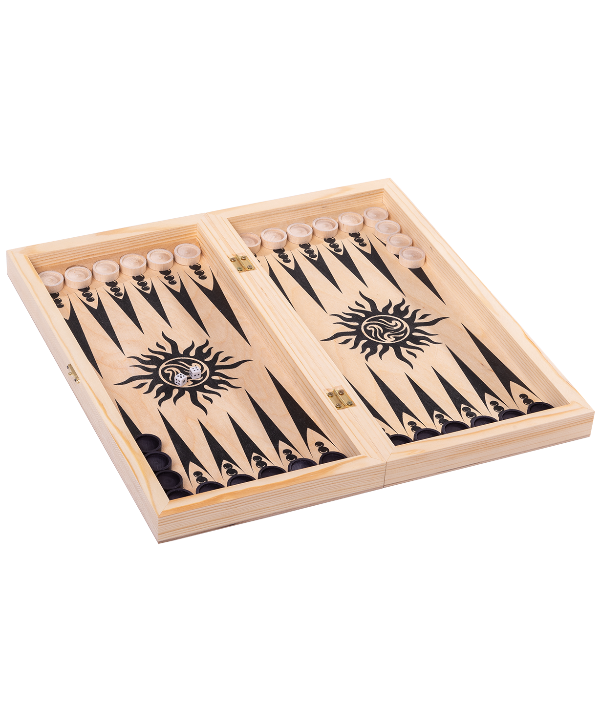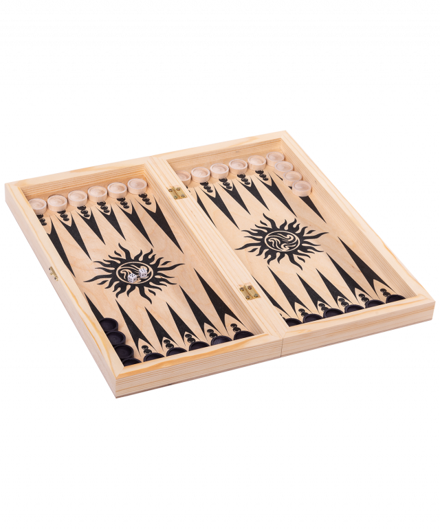 В комплекте: доска, фигуры для шахмат пластмассовые, 30 деревянных фишек, 2 зары