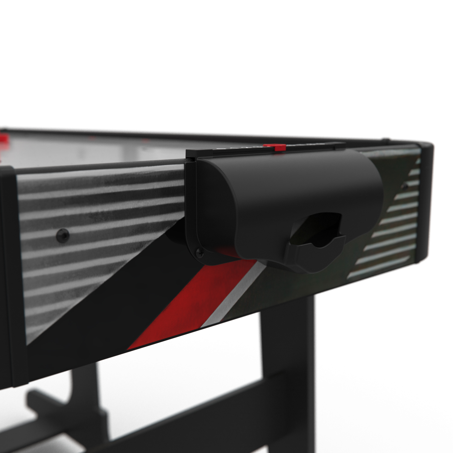 Корпус выполнен из специально обработанного МДФ, сверху покрытого прочной ПВХ пленкой. Воздушный вентилятор подает воздух через отверстия по всей поверхности стола. Питание стола 230В через адаптер. Складная конструкция позволит убрать стол в удобное место и сэкономить место в перерывах между играми.