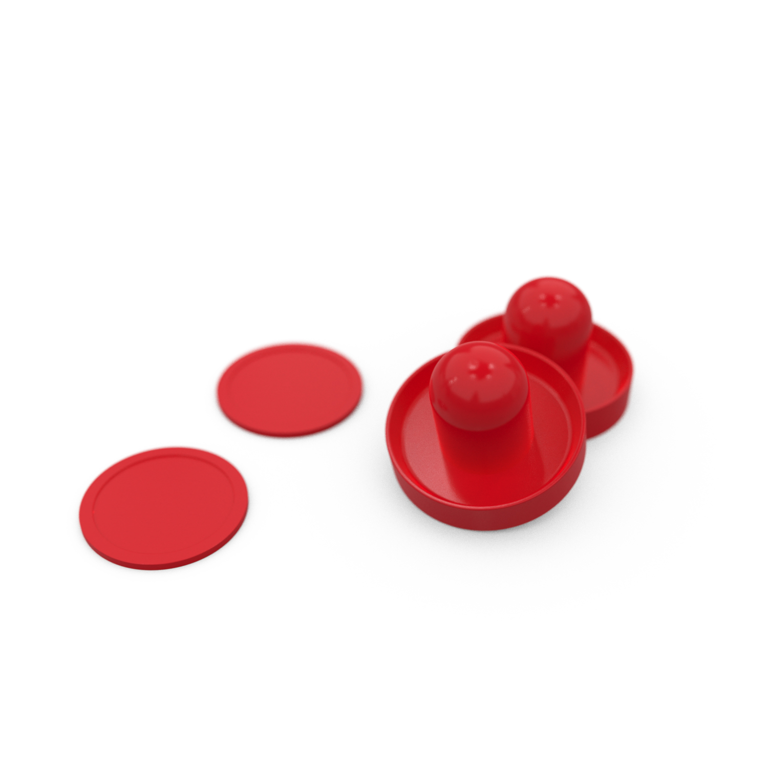 Стол комплектуется необходимым для игры набором аксессуаров: 2 биты и 2 шайбы красного цвета.