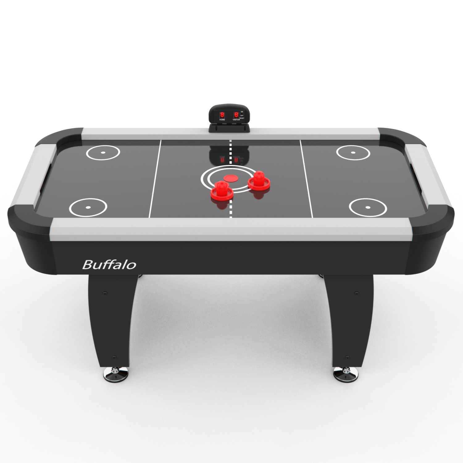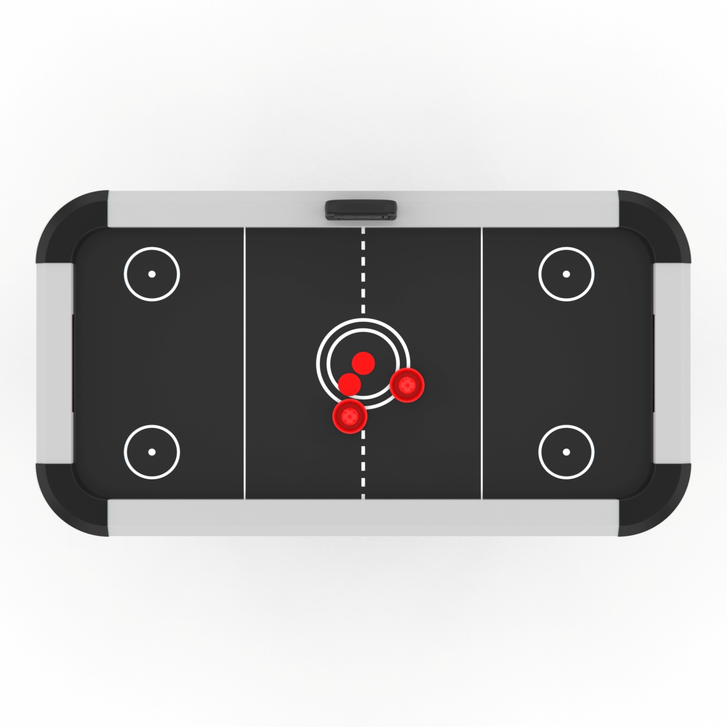 Стол оборудован электронным табло для подсчета очков. Корпус выполнен из специально обработанного МДФ, сверху покрытого прочной пленкой из ПВХ. Мощный компрессор подает воздух через отверстия. Напряжение: 220В.