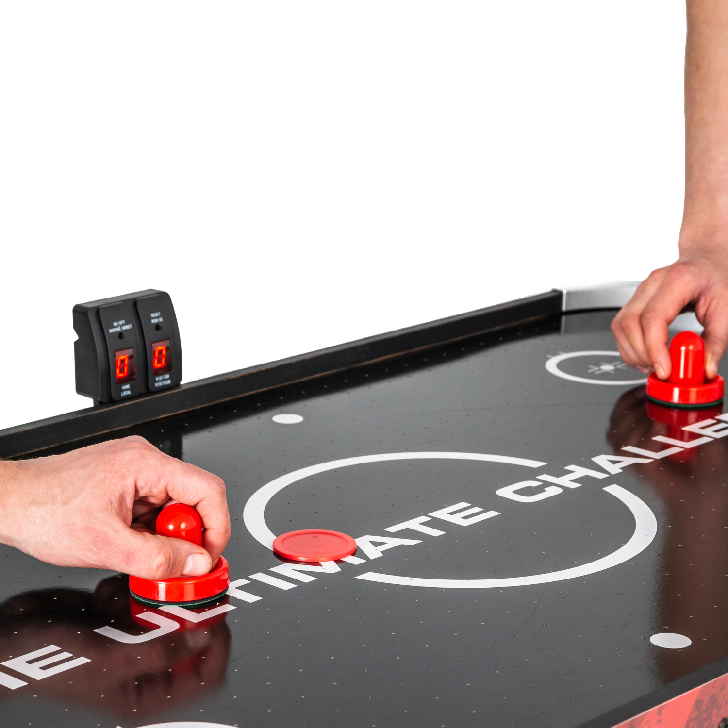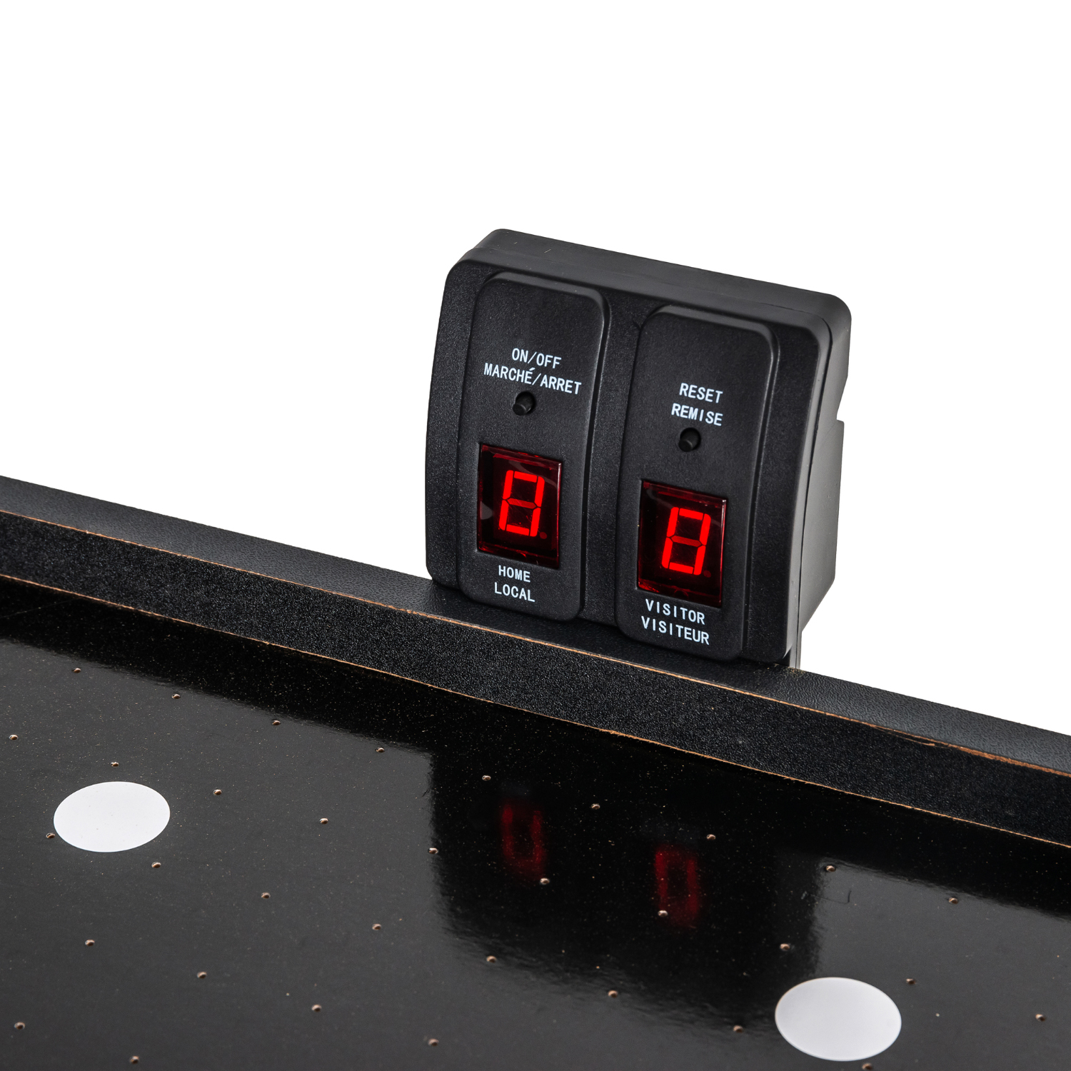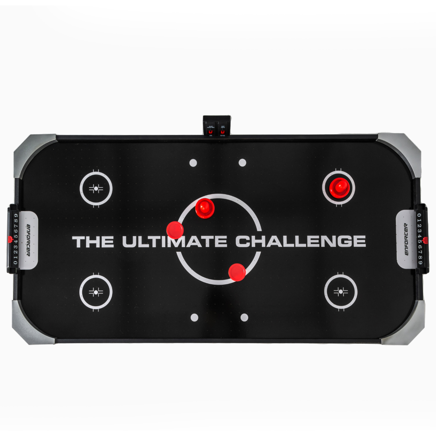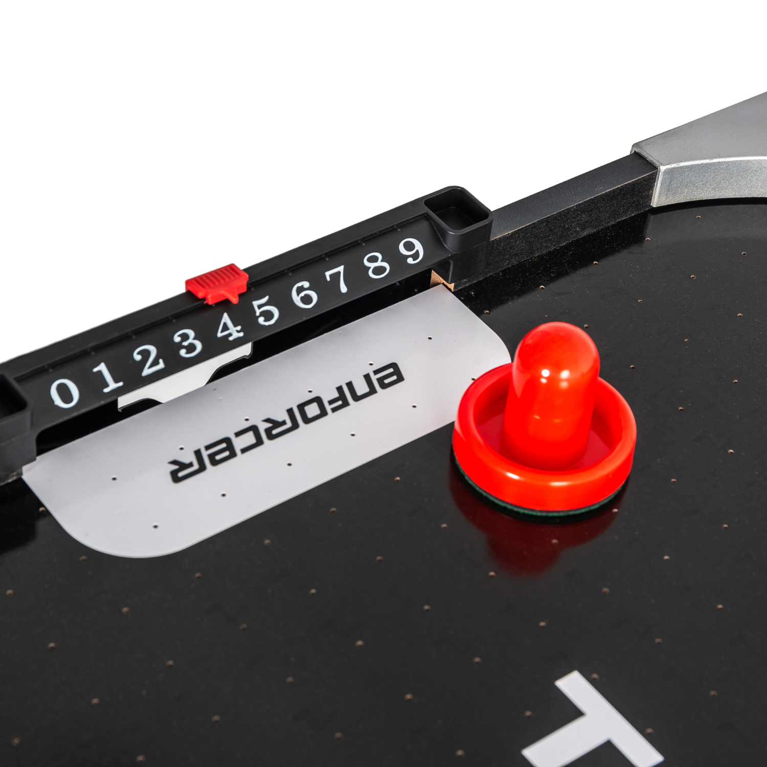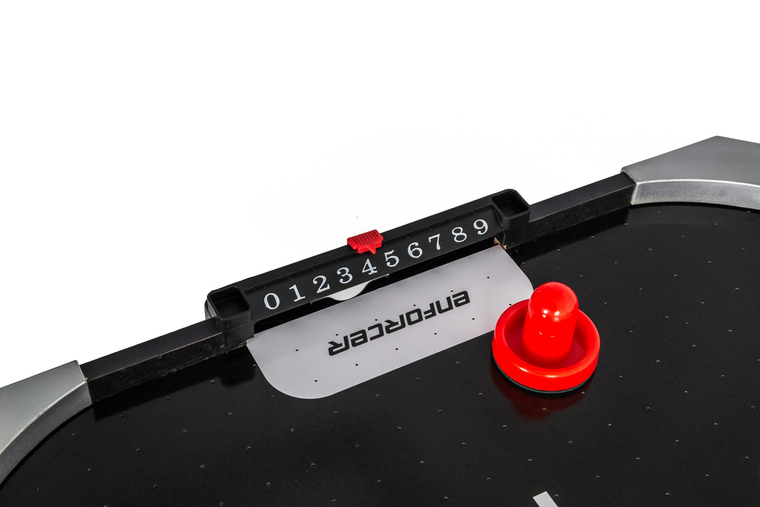 Игровой стол — аэрохоккей DFC ENFORCER оборудован электронным табло для подсчета забитых шайб во время игры. Корпус выполнен из специально обработанного МДФ, сверху покрытого прочным ламинатом. Вентилятор подает воздух через отверстия по всей поверхности стола. Напряжение: 220В (через адаптер).