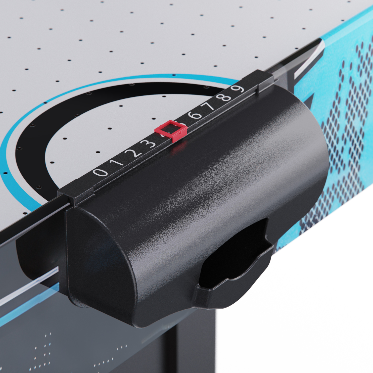 Аэрохоккей LUGANO оборудован электронным табло для подсчета забитых шайб. И дополнительно возле каждого игрока установлен механический счетчик. Корпус выполнен из специально обработанного МДФ, сверху покрытого прочным ПВХ ламинатом. Компрессор подает воздух через отверстия по всей поверхности стола. Напряжение 230В.