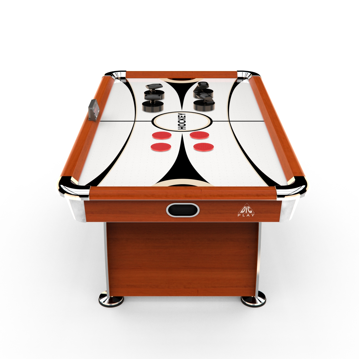 В комплекте имеются две биты, две шайбы и электронный счетчик. Размеры стола составляют 122 см в длину, 60 см в ширину и 76 см в высоту. Материал изготовления — МДФ. Этот игровой стол идеально подойдет для развлечения в кругу друзей или семьи.
