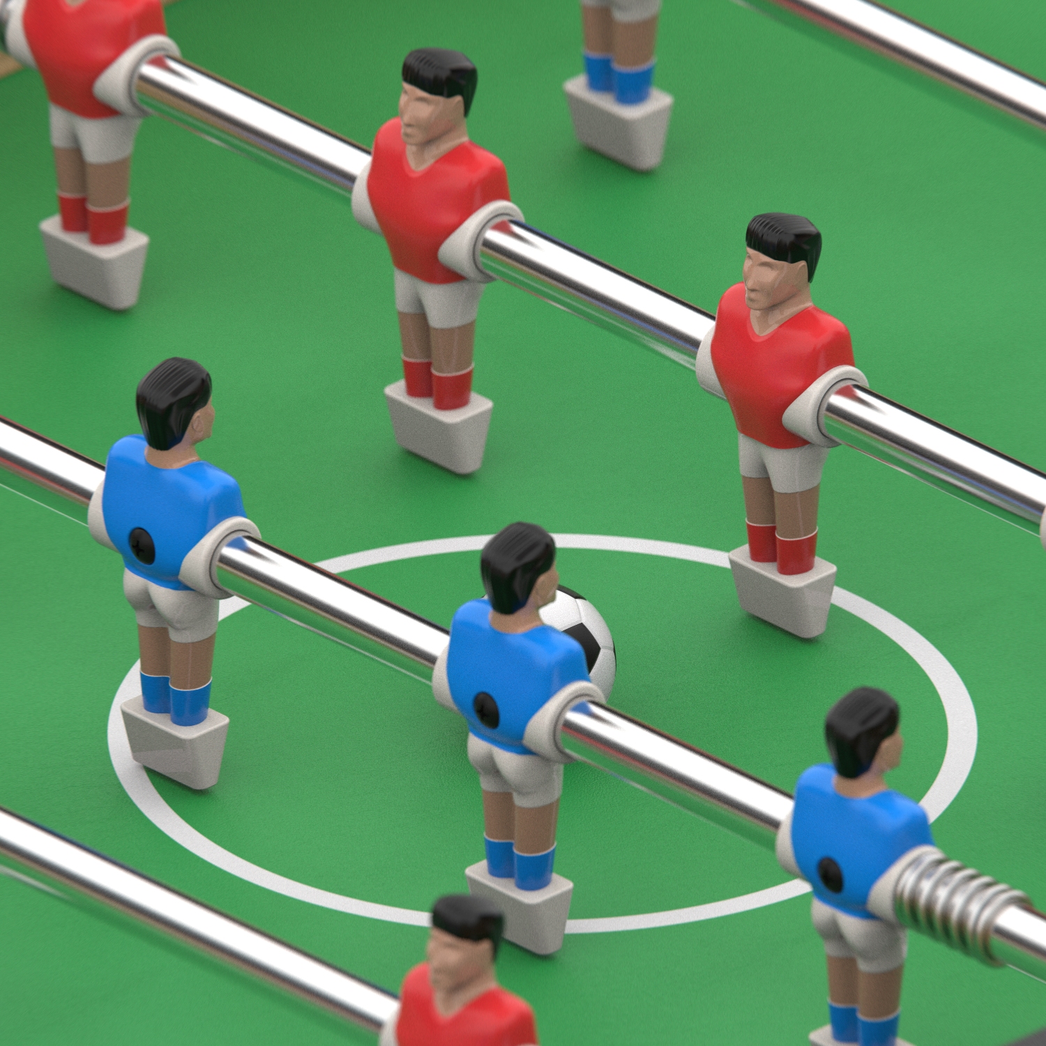 На игровой поверхности с зелёным ПВХ покрытием размером 105 х 58 см и толщиной 4,75 мм нанесена разметка под футбольное поле. 11 игроков с каждой стороны закреплены на телескопических хромированных стержнях (13 см в диаметре) с удобными рукоятками. Механический счётчик голов на обоих воротах помогает вести счёт игры.
