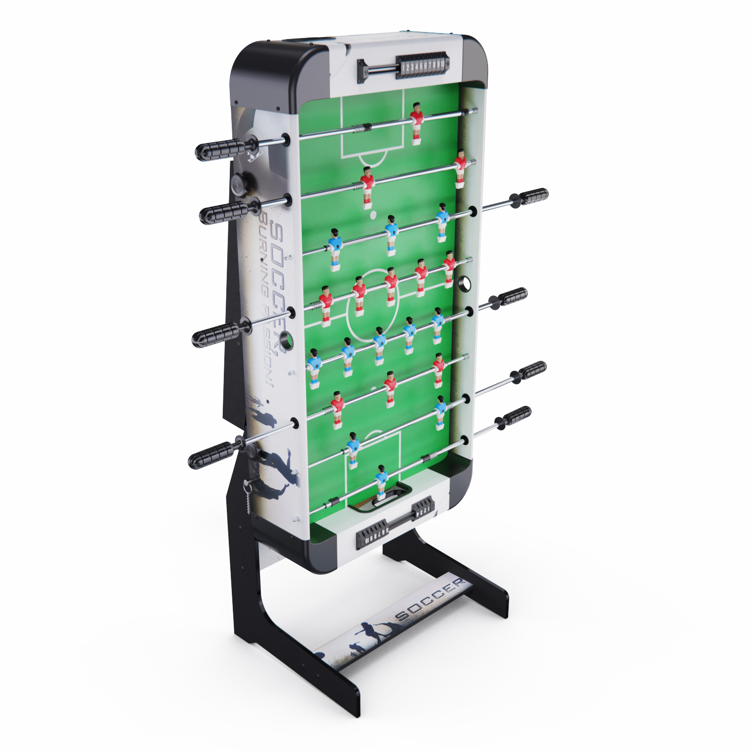 Игровой стол-футбол DFC SOCCER BP SB-ST-29398 для домашнего использования. Складная модель. Боковые стороны из МДФ ламинированным ПВХ высотой 19,5 см и толщиной 12 мм. Стороны со стороны игроков высотой 19,5 см и толщиной 9 мм. L-образная ножка из МДФ толщиной 15 мм, средняя – 12 мм. Телескопические стержни диаметром 13 мм с хромированным покрытием. В комплекте 2 футбольных мяча 31 мм диаметром.