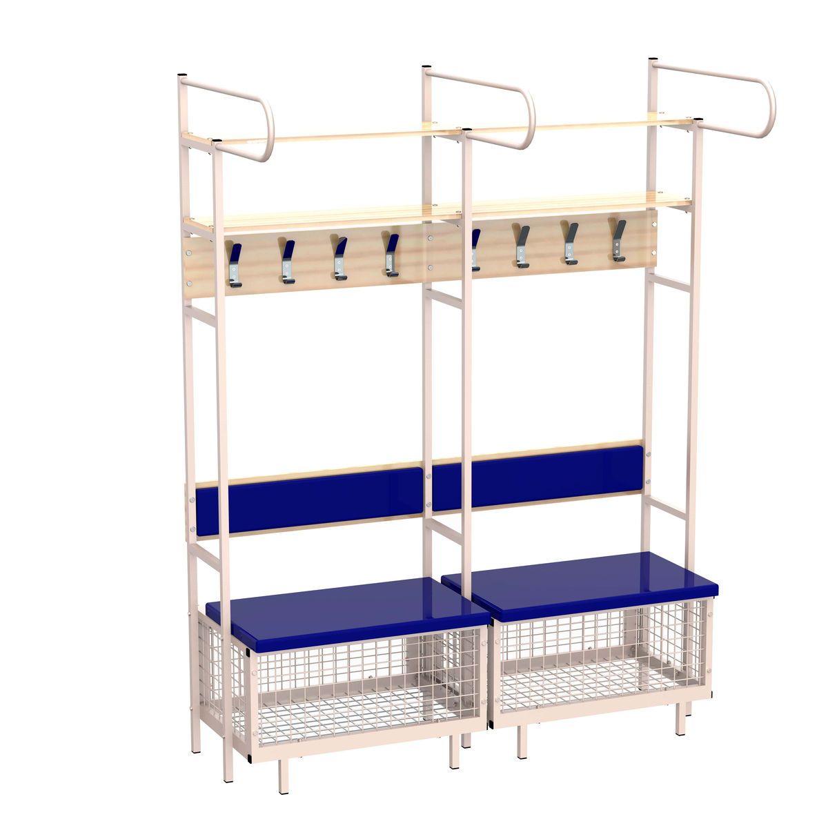 Включает в себя крючки для одежды и экипировки, скамью-ящик для хранения обуви и коньков, и две полки. Каркас места выполнен из металлической профильной трубы 25*25 мм, стенка 1,5 мм. Полки выполнены из ЛДСП 16 мм. Сиденье и спинка выполнены из фанеры 15 мм, оклеены вторичным полиуретаном и обтянуты экокожей. Основные размеры: 1750*2100*620 мм. Вес: 90 кг.