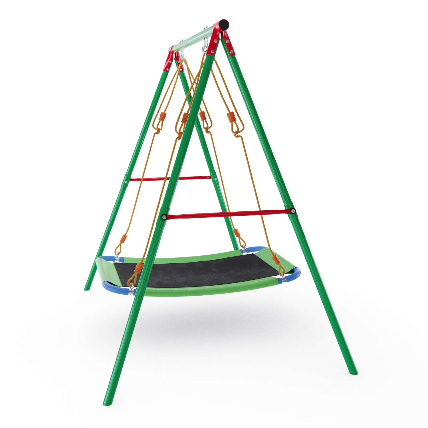 Размеры конструкции составляют 181×153×196 см плюс размах, поэтому устанавливать качели лучше на открытом месте участка. Сиденье выполнено в виде гамака, покрытого мягкой сеточкой, которое крепится к прочной металлической раме.