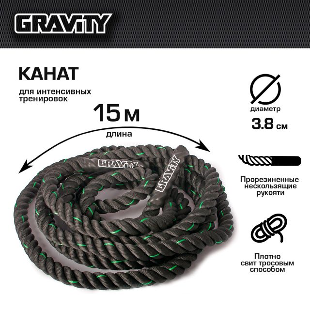 Канат Gravity можно использовать для целого ряда интенсивных упражнений, активирующих кор и заставляющих работать все тело: рубки, волн, rope jack, бросков и тяги. Удобные прорезиненные рукояти обеспечивают надежный хват, даже когда ладони тренирующегося промокли от пота, а плотное плетение исключает появление разрывов и потертостей. Теперь канаты Gravity, главное тренировочное снаряжение бойцов смешанных единоборств, доступны и вам! Какие бы цели вы ни ставили перед собой, с канатами ваши тренировки выйдут на новый уровень
