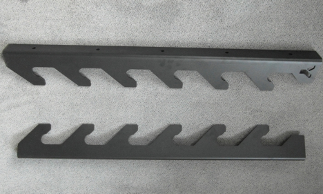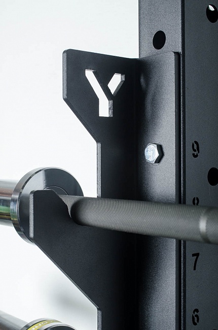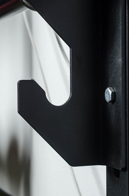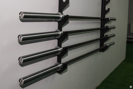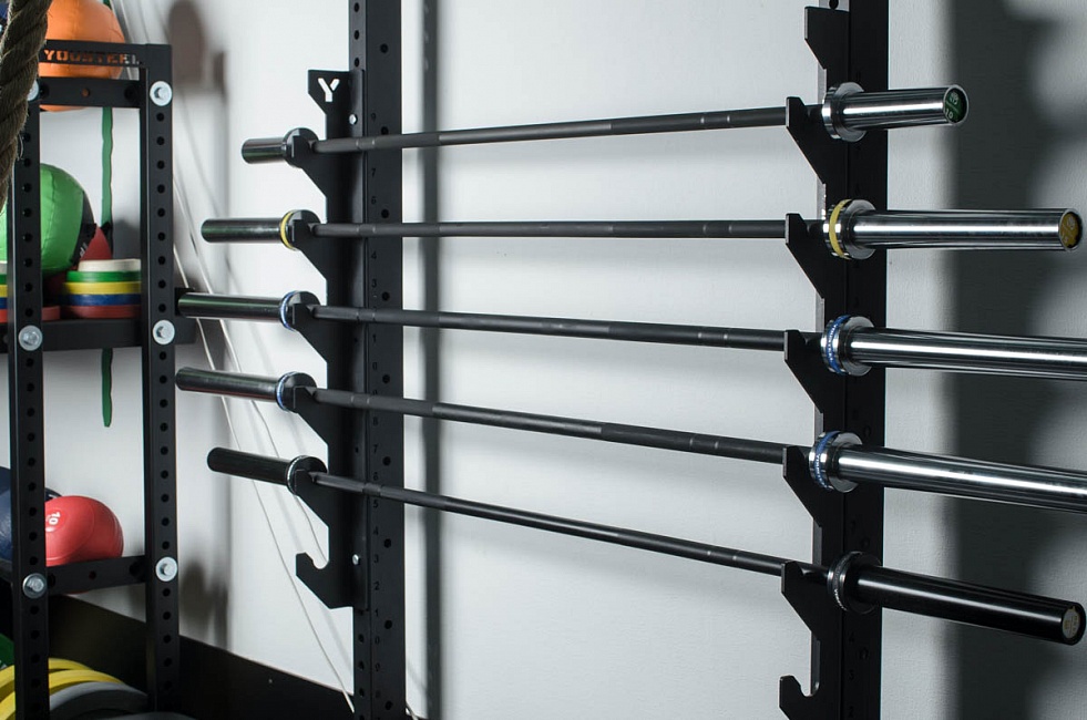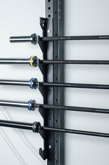 Кстати, о штангах. Настенный кронштейн для хранения грифов &mdash наиболее эффективное решение, с точки зрения организации пространства. Прикрепив его на стену один раз, вы сможете держать до 8 снарядов в одном месте (в данном случае 6), не беспокоясь за их сохранность и высвобождение дополнительного места.