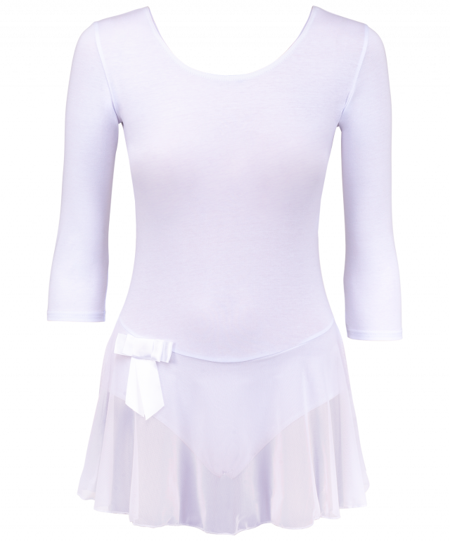 Гимнастический купальник не сковывает движений и дарит комфорт. Модель с округлым вырезом и рукавом 34, дополненный юбкой из полупрозрачной сетки по линии бёдер. Купальник выполнен из качественного износостойкого хлопка, не теряет форму после стирки. Идеально подходит для занятий художественной гимнастикой или танцами, приятен к телу. Соответствует требованиям качества, предъявляемым к пошиву детской одежды. Цвет: белый.