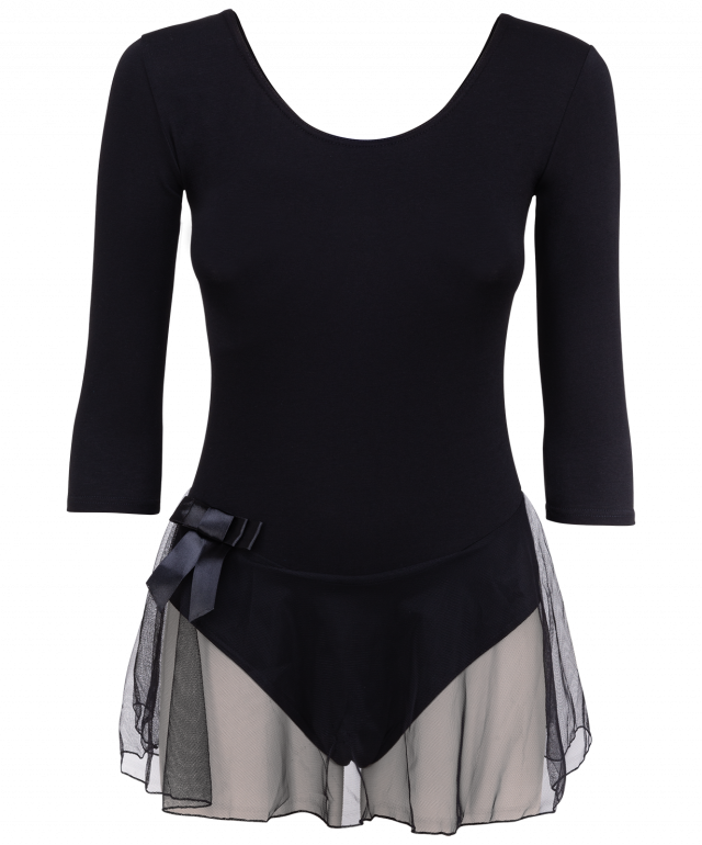 Гимнастический купальник не сковывает движений и дарит комфорт. Модель с округлым вырезом и длинным рукавом, дополненный юбкой из полупрозрачной сетки по линии бёдер. Купальник выполнен из качественного износостойкого хлопка, не теряет форму после стирки. Идеально подходит для занятий художественной гимнастикой или танцами, приятен к телу. Соответствует требованиям качества, предъявляемым к пошиву детской одежды. Цвет: черный.
