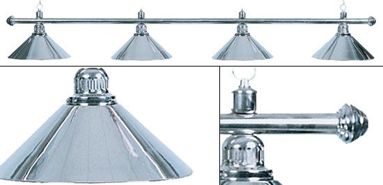 Изящная лампа классического дизайна органично впишется в любой интерьер. Устойчивые к механическим повреждениям металлические плафоны на металлической штанге обеспечивают не только качественное освещение игрового поля, но и создадут уютную атмосферу в бильярдном клубе или кабинете. Комплектуется цепочками и чашками для крепления к потолку. Предназначена для равномерного освещения игрового поля 8 — 9 футовых столов.