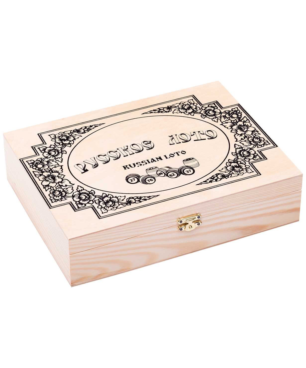 Набор для игры в лото с деревянными бочонками. Бочонки упакованы в тканевый мешочек из бязи, с завязками. Картонные карточки в комплекте. Упаковка выполнена из фанеры, нанесен рисунок (шелкография), лаковое покрытие.