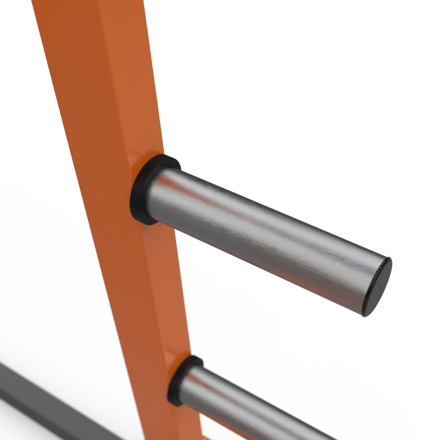 Диаметр дисков для хранения 51 мм, нагрузка на каждый из держателей дисков до 60 кг. Расстояние между держателями для хранения позволяет размещать бамперные диски диаметром до 450 мм. Размер основной рамы 70 х 50 х 2 мм, размер соединительных перекладин 50 х 50 х 2 мм. Высота грифа регулируется по высоте в 10-ти положениях.