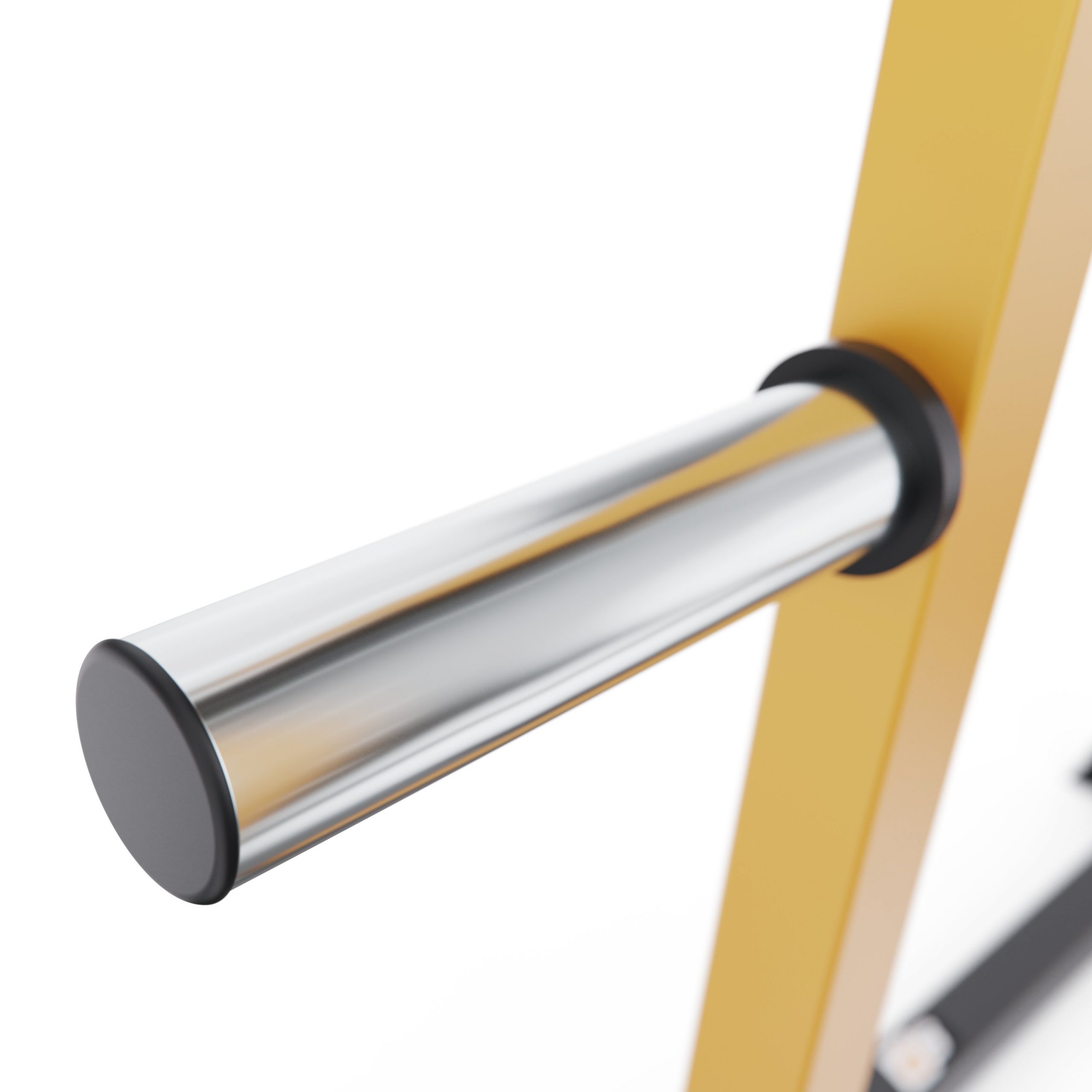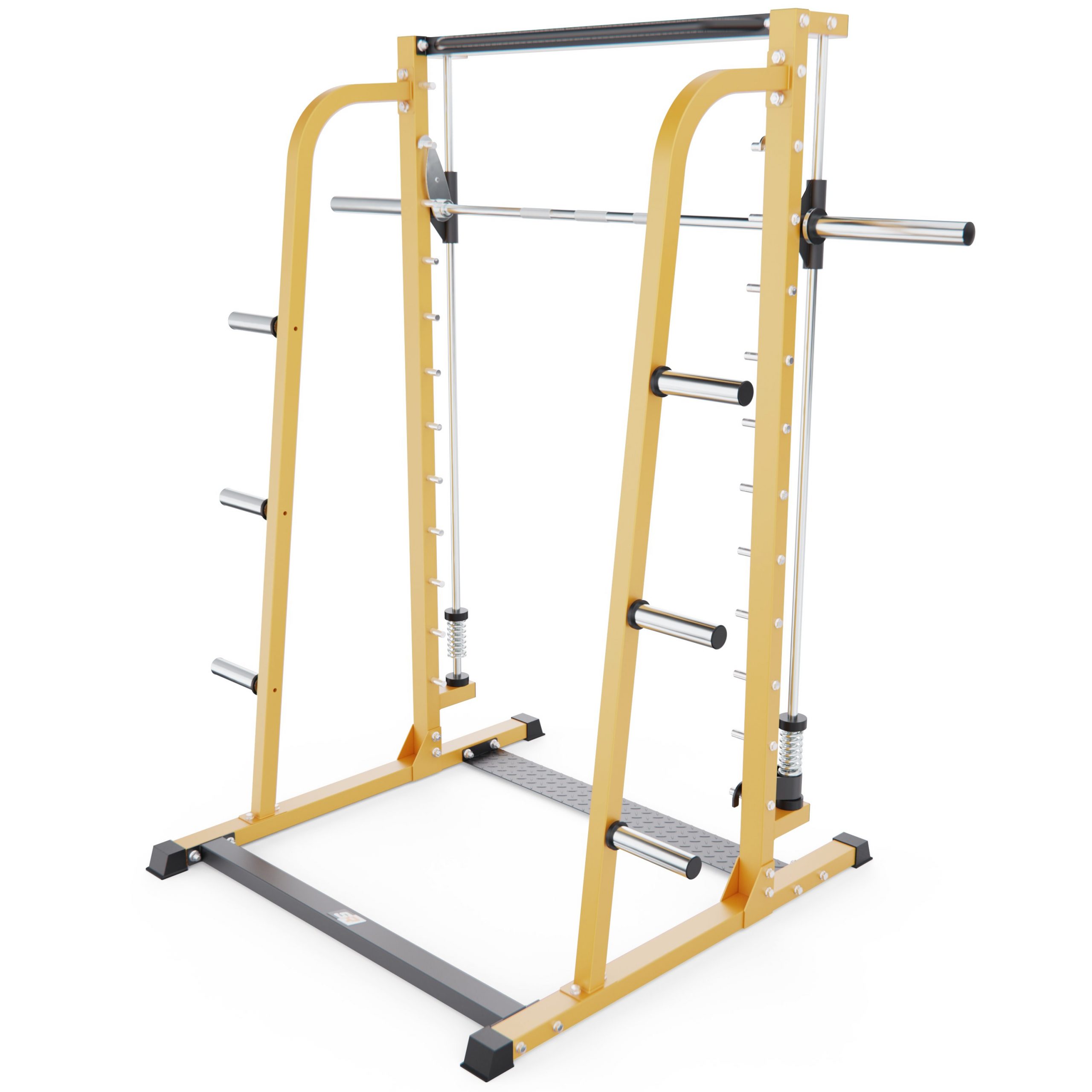 Каркас изготовлен из прочной стали с профилем 70 х 50 х 2 мм, что гарантирует устойчивость и долговечность конструкции. Машина оснащена встроенным грифом длиной 180 см с посадочным диаметром 50 мм и максимальной нагрузкой до 300 кг. Для хранения дисков предусмотрено 6 посадочных мест диаметром 50 мм, каждое из которых выдерживает нагрузку до 150 кг.