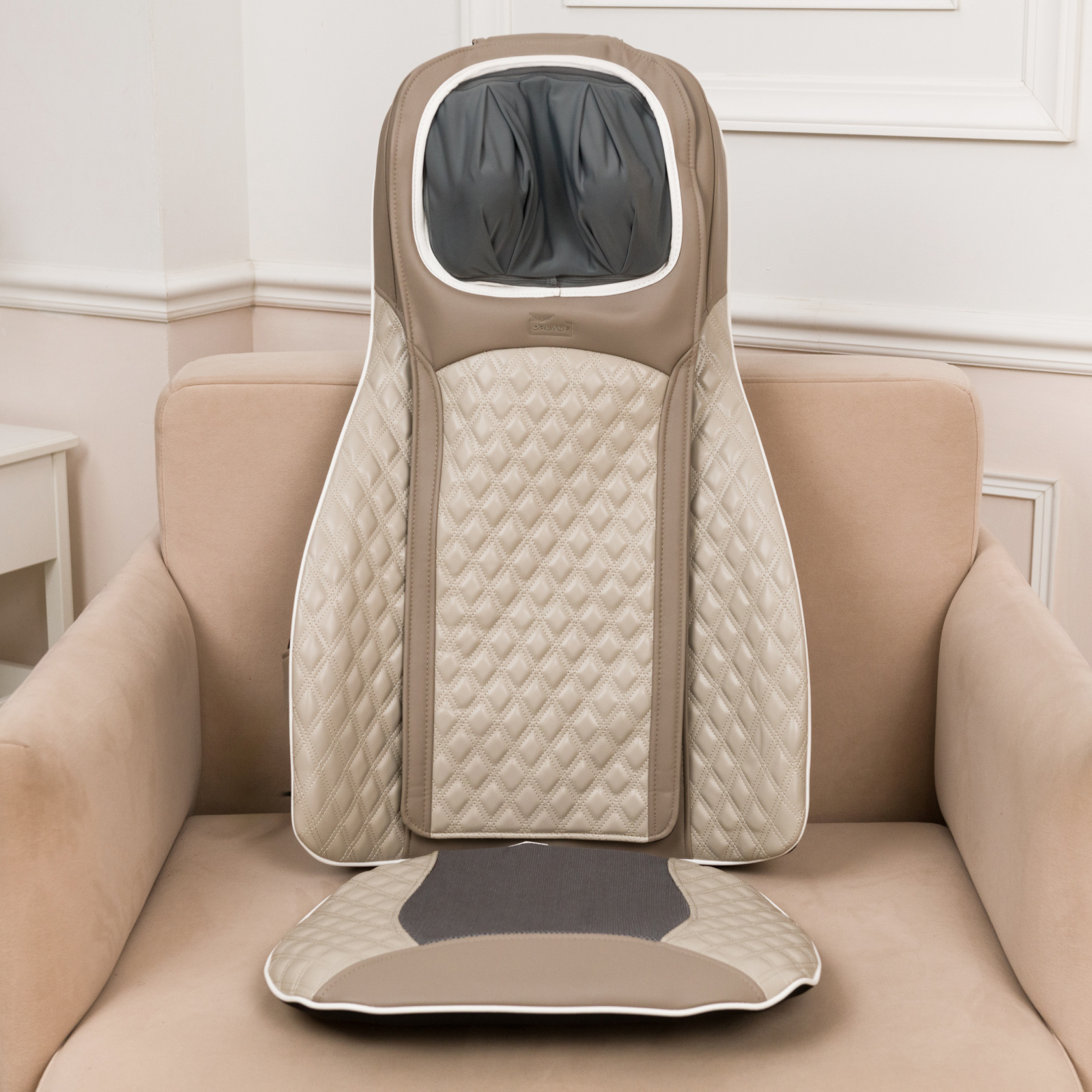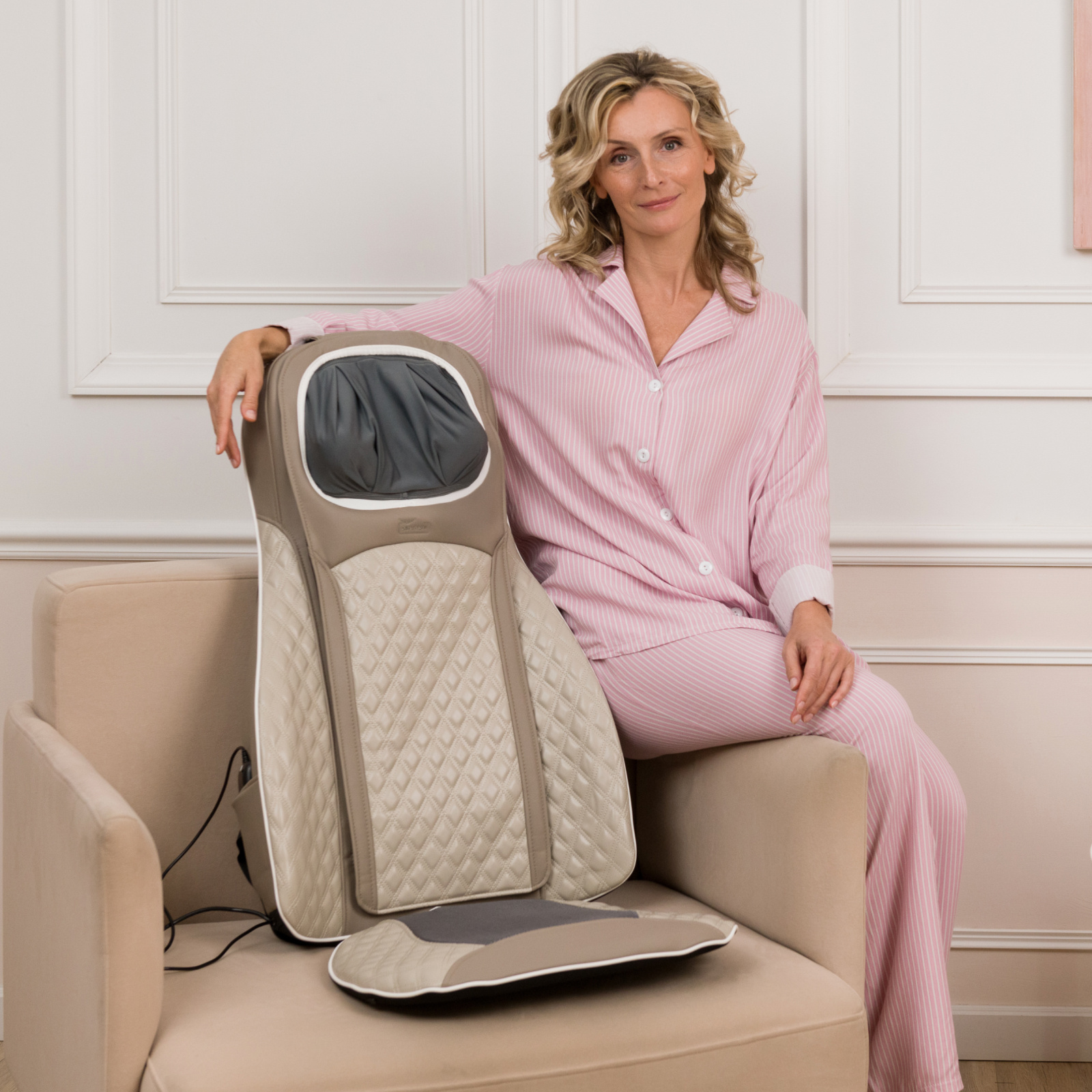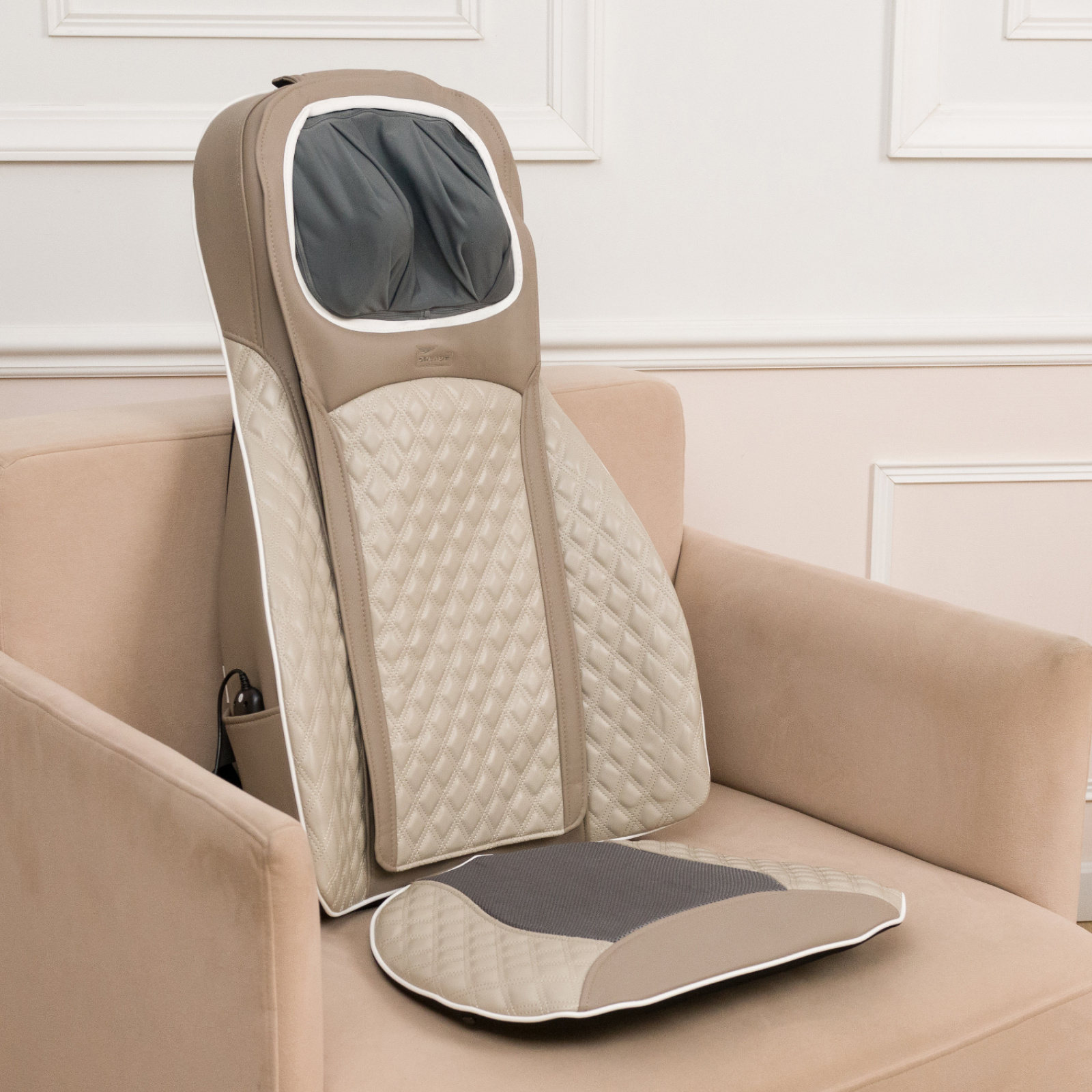 Устройство оснащено двумя манипуляторами в области шеи, имитирующими ручной массаж, что способствует глубокой проработке шейно-воротниковой зоны. Две пары роликов, расположенные в области спины и поясницы, эффективно воздействуют на мышцы, помогая снять напряжение и усталость. Пользователь может выбрать один из трех уровней мощности, настроив интенсивность массажа под свои потребности.