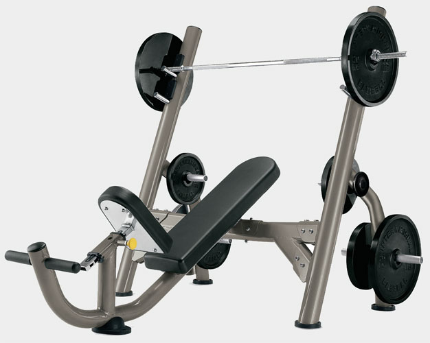 Наклонная олимпийская скамья для жима. Угол наклона — 30 градусов. Регулируемое сиденье. Подставки для дисков.