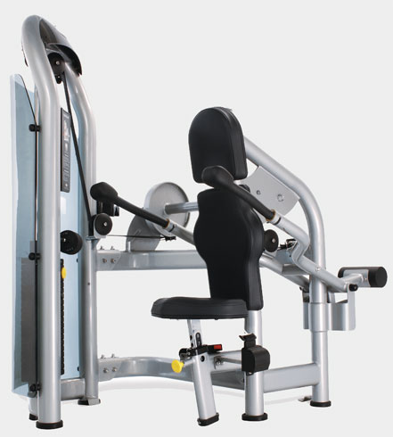 Профессиональный силовой тренажер — отжимание сидя. Спинка наклонена вперед для снятия перенапряжения с плеч. Специальное покрытие рукояток предотвращает проскальзывание. Регулировка высоты сиденья. Биомеханически верная траектория движения. Защита весового стека акриловым щитом.