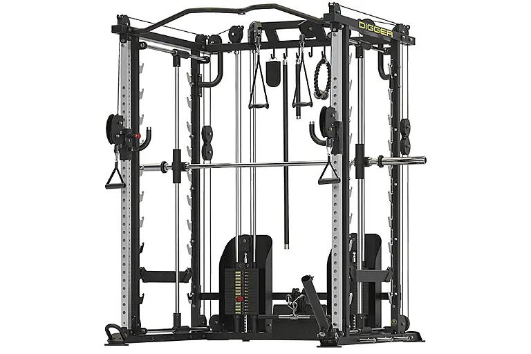 Сочетает в себе: 3D Машину Смита, двойную регулируемую тягу, силовую раму, нижнюю тягу, два независимых блока внутри рамы для верхней тяги, тренажер Landmine, крепление для каната, блочные ручки и манжеты для различных упражнений в комплекте.