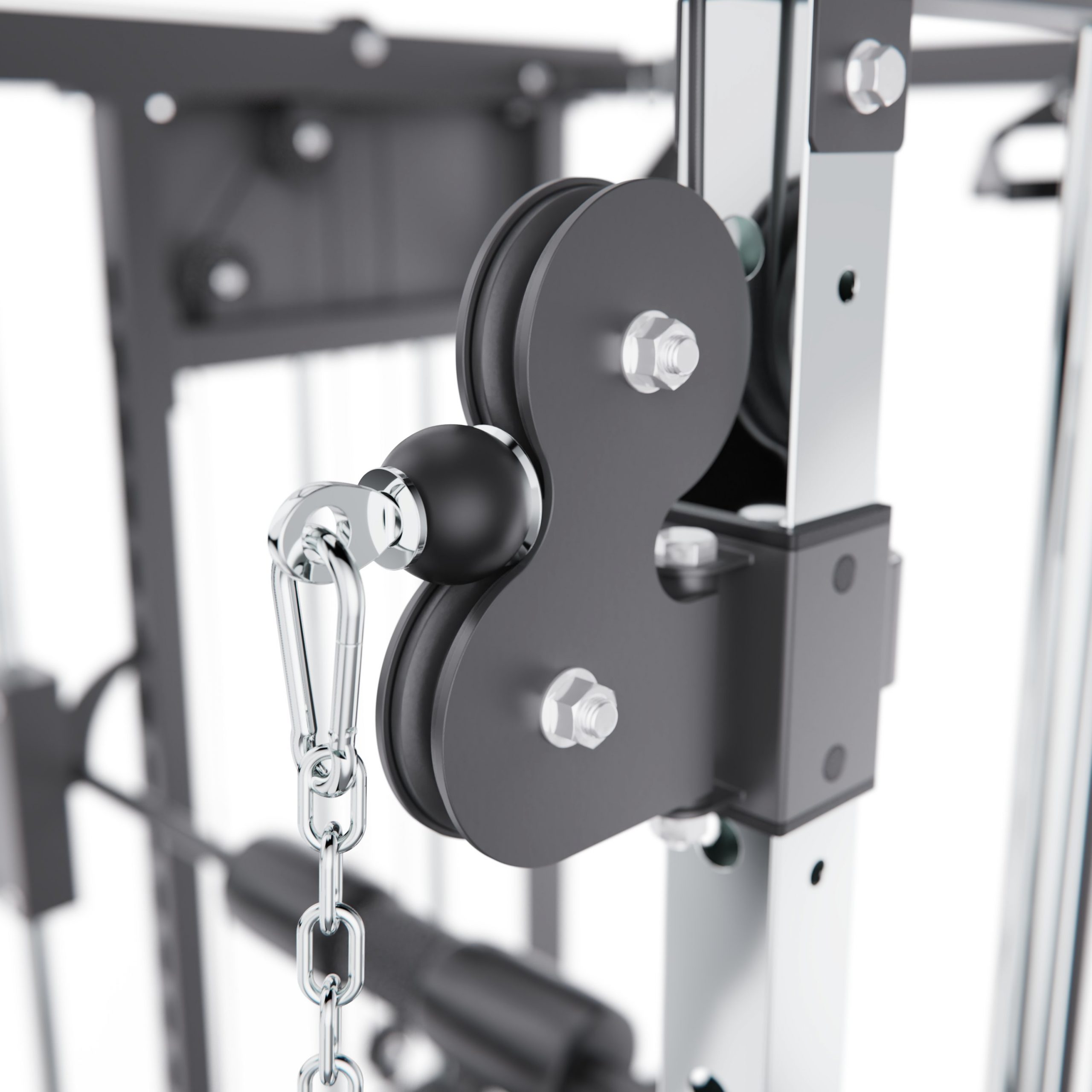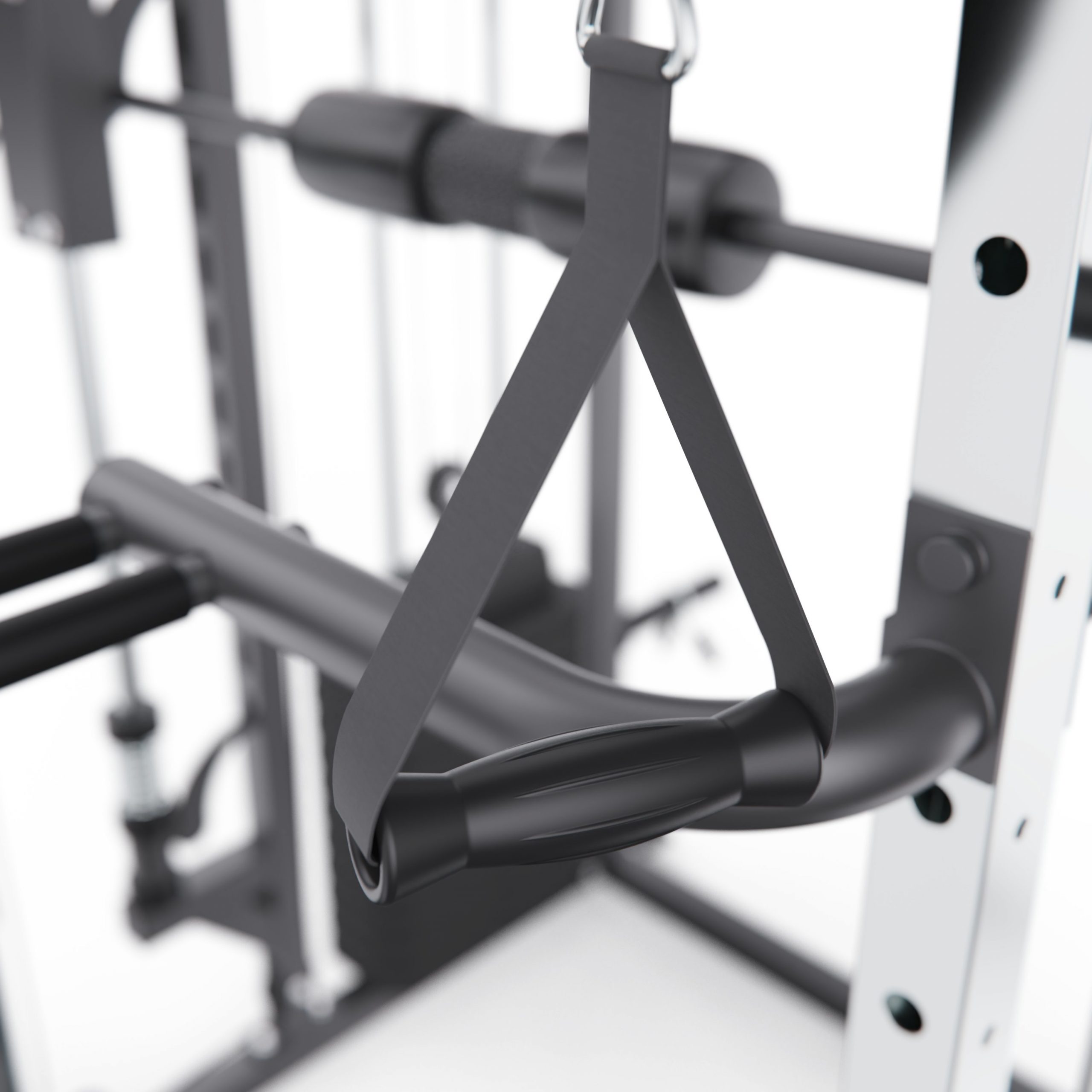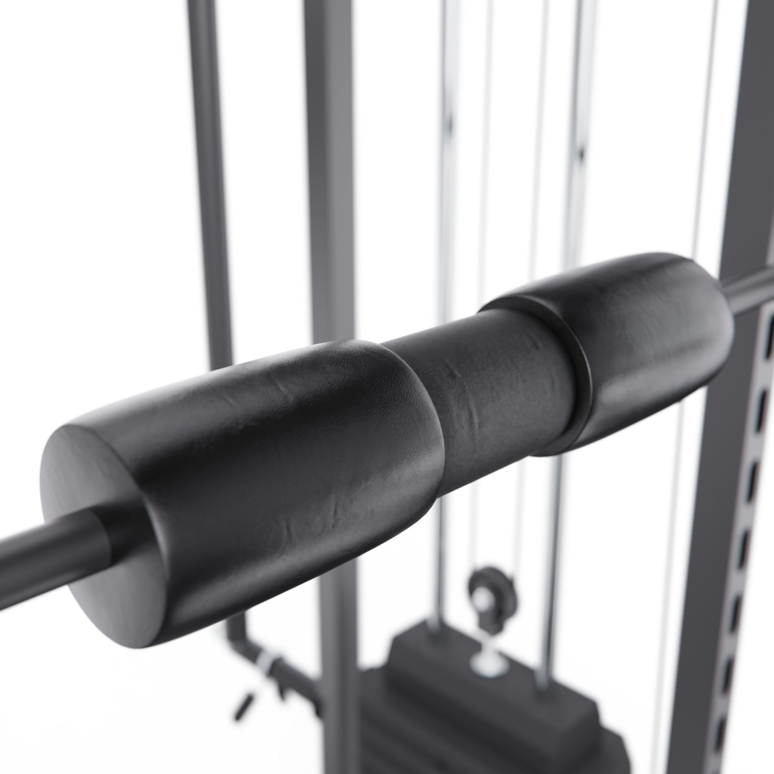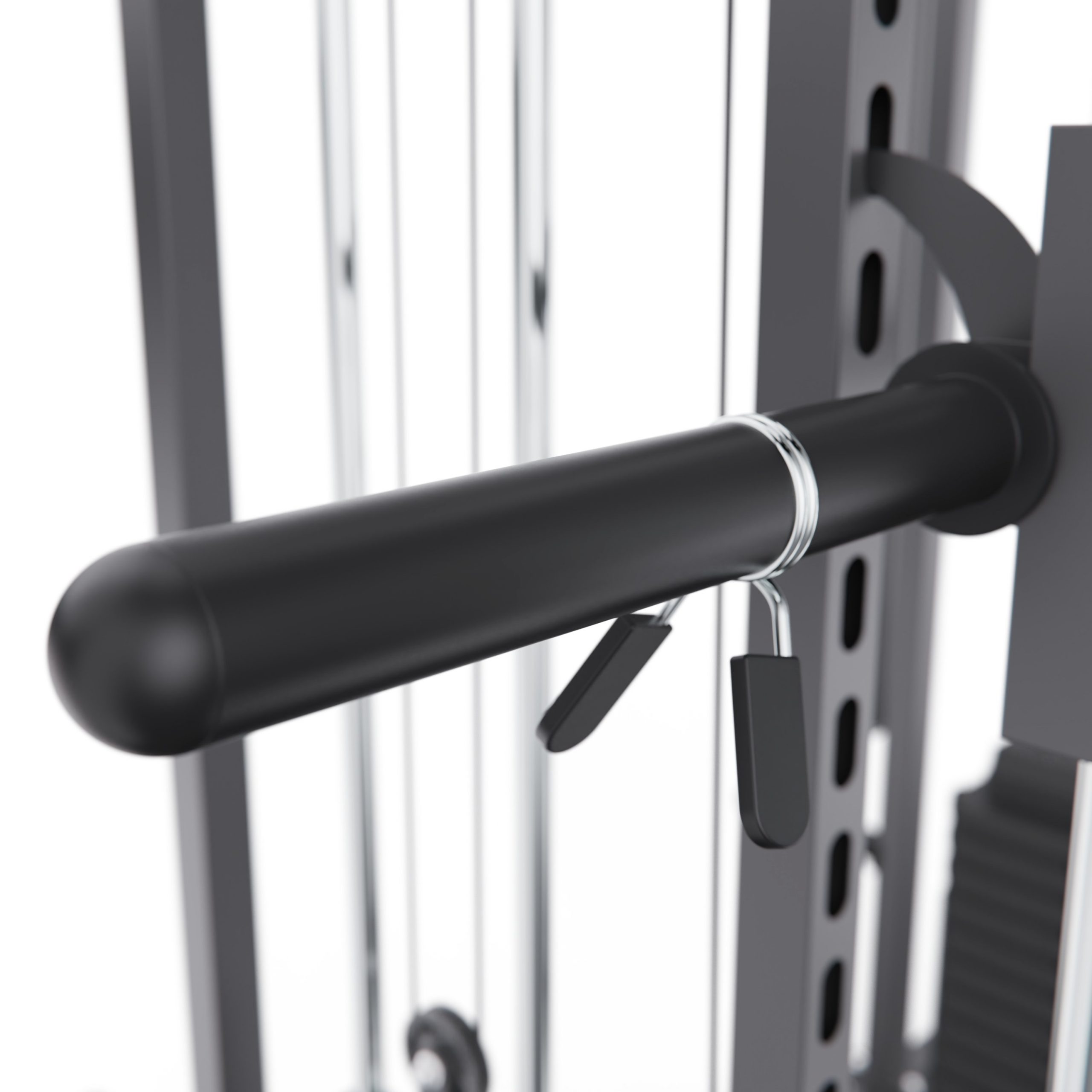 Тренажёр оснащён верхними и нижними блоками, а также набором рукоятей: прямая, V-образная, манжета для ног и дополнительные адаптеры. Система тросов использует тросы длиной 60 см и диаметром 5 мм, оснащённые пружинами и фиксаторами, что обеспечивает плавный ход, точную регулировку нагрузки и долговечность в условиях интенсивной эксплуатации. На стойках расположены держатели для весовых пластин, а встроенный гриф имеет длину 80 см и толщину 5 мм, что обеспечивает удобную загрузку дисков и стабильную работу при выполнении упражнений.
