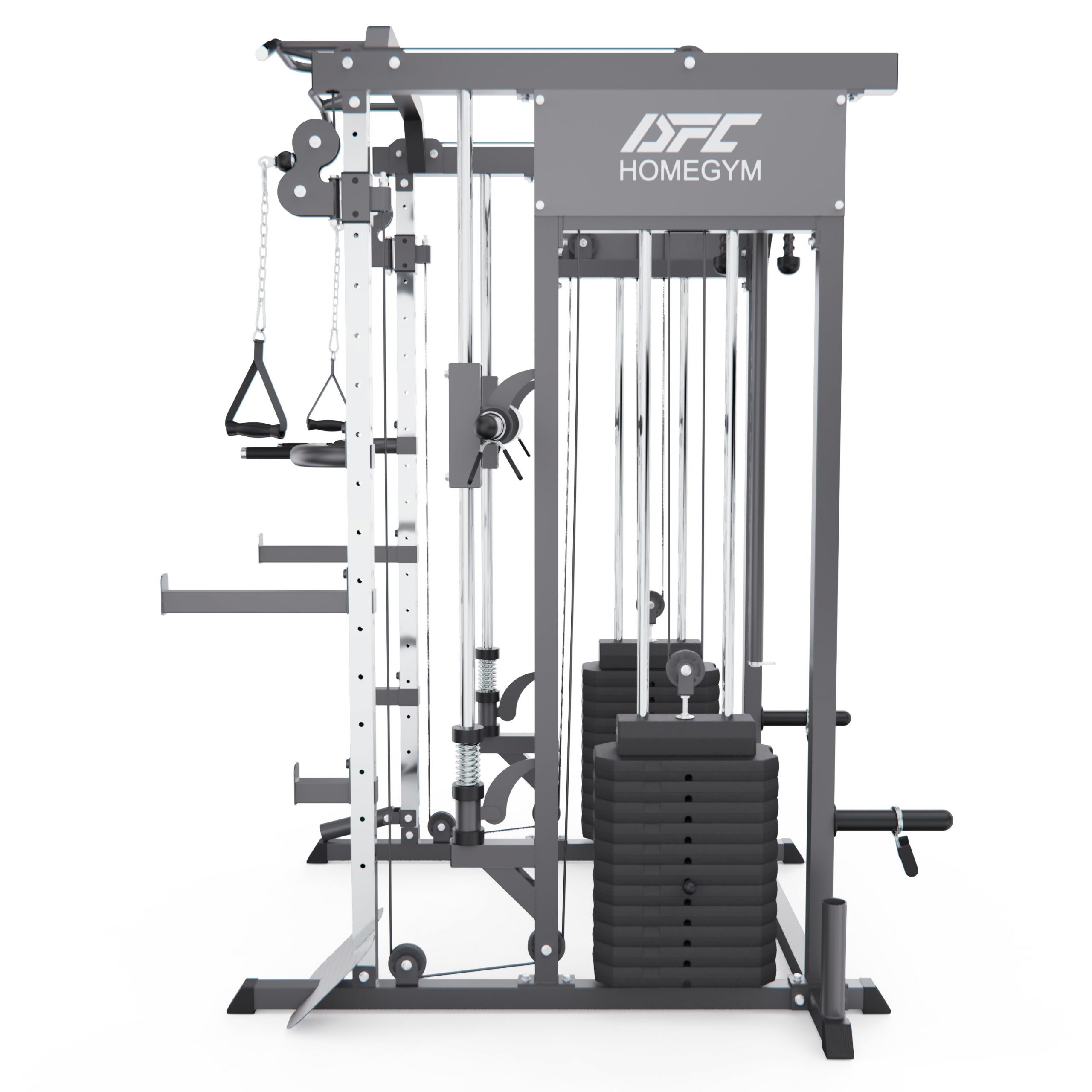 Машина Смита DFC D8201 — это полноценный домашний тренажёрный комплекс, который сочетает в себе возможности силовой рамы, модульных рукоятей и блоковых систем.